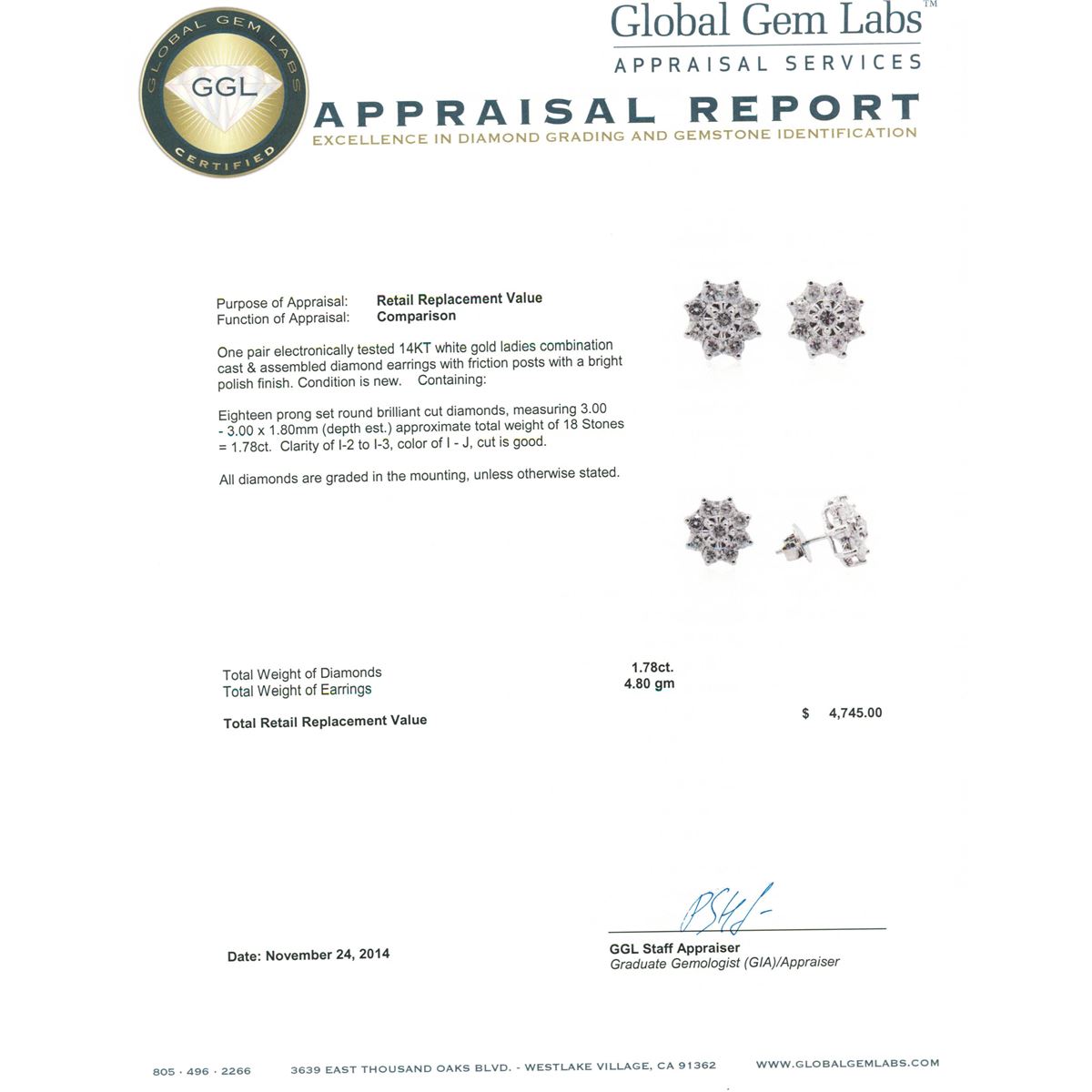 One pair electronically tested 14KT white gold ladies combination cast & assembled diamond earrings with friction posts with a bright polish finish. Condition is new. Containing: Eighteen prong set round brilliant cut diamonds, measuring 3.00 - 3.00 x 1.80mm (depth est.) approximate total weight of 18 Stones = 1.78ct. Clarity: I-2 to I-3. Color: I - J, Cut is Good. All diamonds are graded in the mounting, unless otherwise stated. Total Weight of Diamonds 1.78ct. Total Weight of Earrings 4.80 grams. GGL Appraised at $4,745.00.