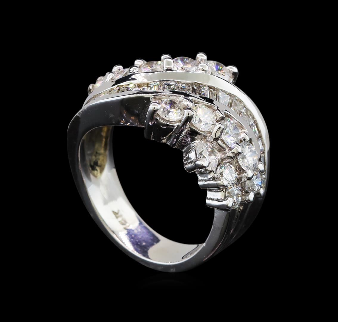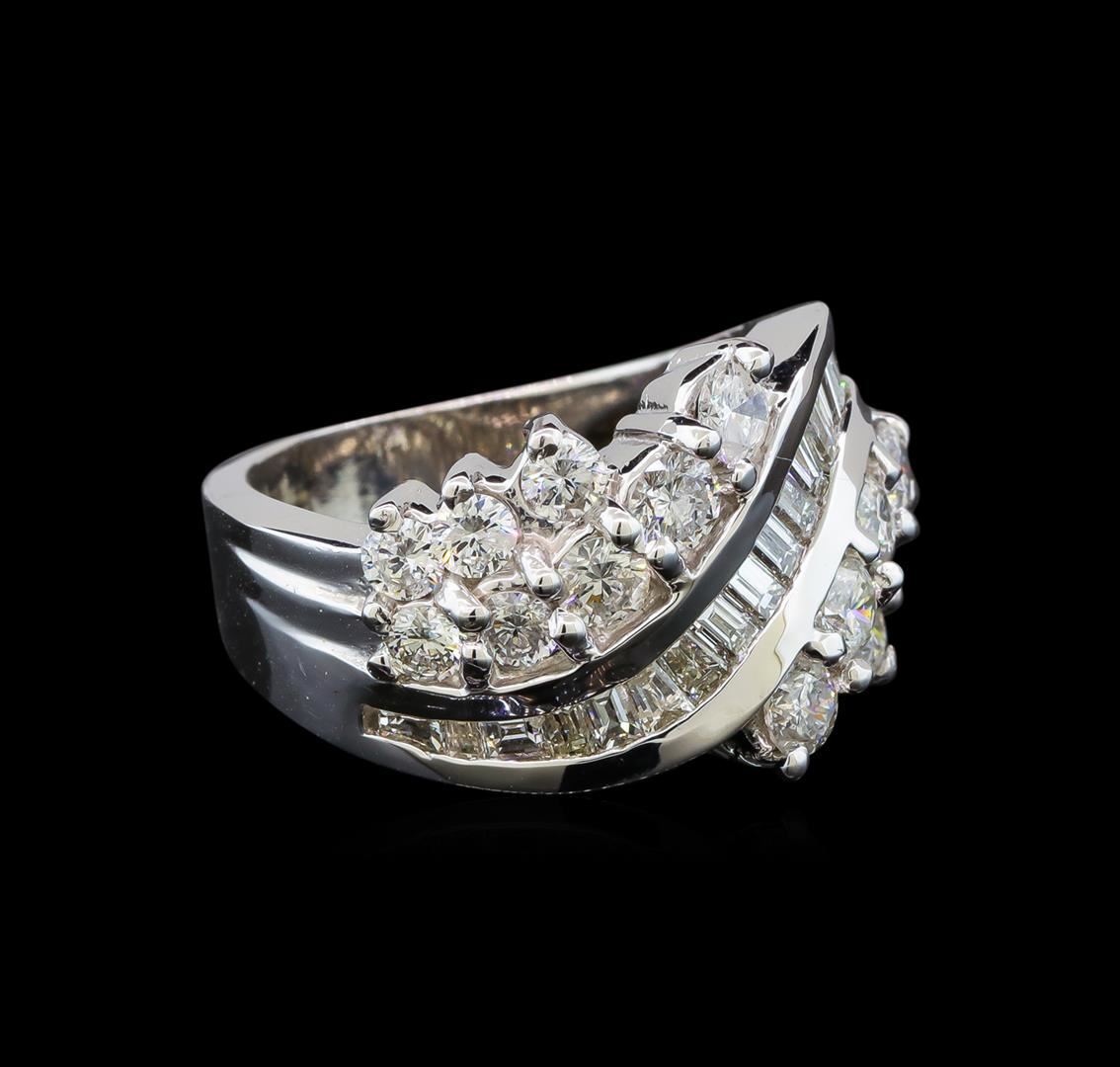 One electronically tested 14KT white gold ladies cast diamond ring with a bright polish finish. Identified with markings of "14K". Condition is new. Containing: Eighteen channel set baguette cut diamonds, measuring from 1.30 x 1.30 x 1.11mm (depth est.) to 2.80 x 1.50 x 1.28mm (depth est.) approximate total weight of 18 Stones = 0.56ct. Clarity: VS-1. Color: H - I, Cut is Good. Sixteen prong set round brilliant cut diamonds, measuring 3.00 - 2.50 x 1.65mm (depth est.) approximate total weight of 16 Stones = 1.22ct. Clarity: SI-1 to I-1. Color: I - J, Cut is Good. All diamonds are graded in the mounting, unless otherwise stated. Total Weight of Diamonds 1.78ct. Total Weight of Ring 9.10 grams. GGL Appraised at $5,285.00.