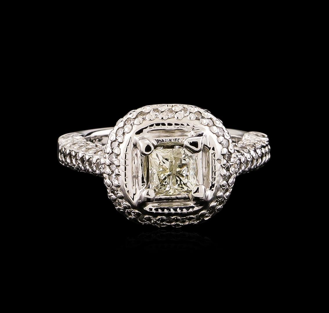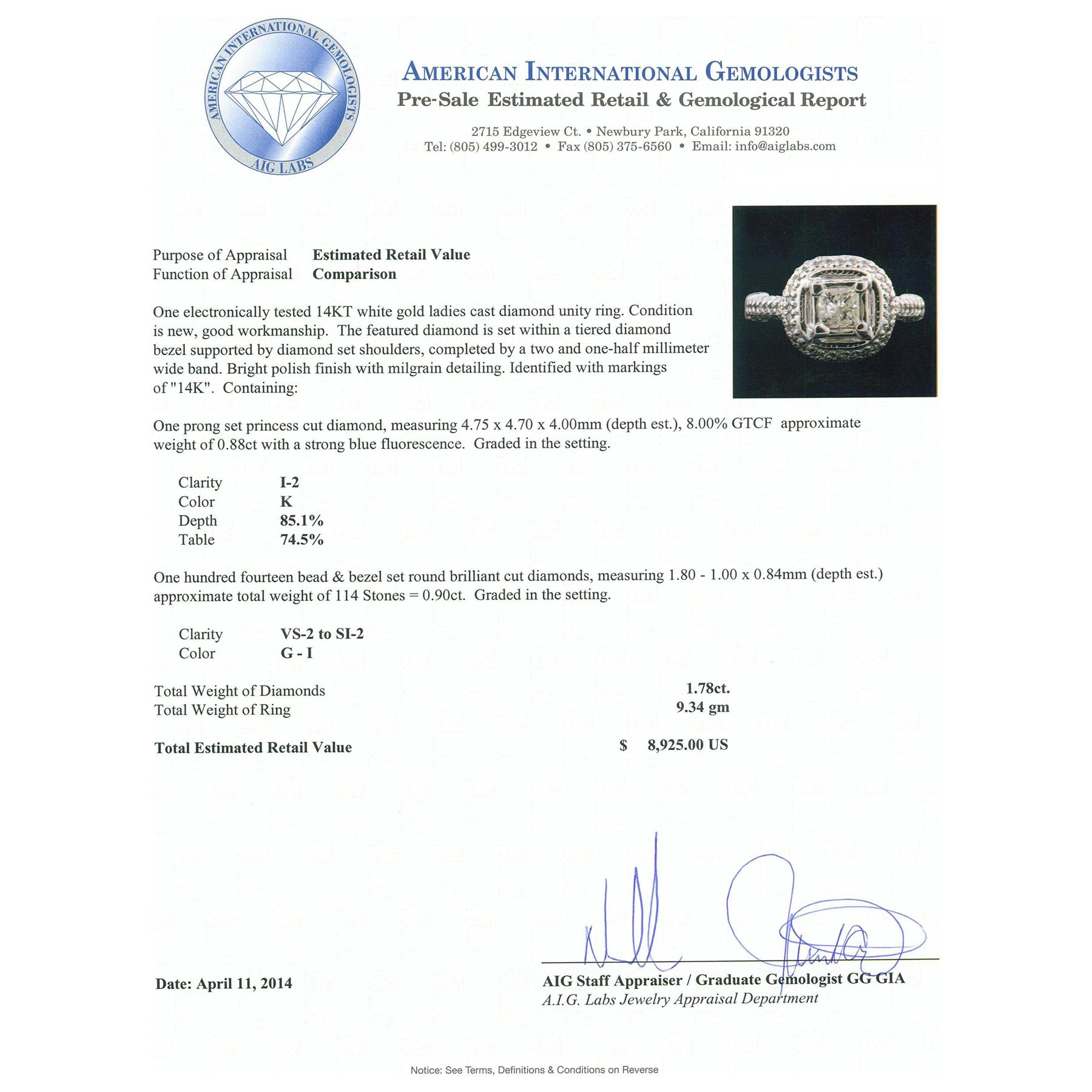One electronically tested 14KT white gold ladies cast diamond unity ring. Condition is new, good workmanship. The featured diamond is set within a tiered diamond bezel supported by diamond set shoulders, completed by a two and one-half millimeter wide band. Bright polish finish with milgrain detailing. Identified with markings of "14K". Containing: One prong set princess cut diamond, measuring 4.75 x 4.70 x 4.00mm (depth est.), 8.00.%. GTCF approximate weight of 0.88ct with a strong blue fluorescence. Graded in the setting. Clarity: I-2. Color: 85.1%. Table 74.5%. One Hundred Fourteen bead & bezel set round brilliant cut diamonds, measuring 1.80 - 1.00 x 0.84mm (depth est.) approximate. Total Weight of 114 Stones = 0.90ct. Graded in the setting. Clarity: VS-2 to SI-2. Color: G - I. Total Weight of Diamonds 1.78ct. Total Weight of Ring 9.34 grams. AIG Appraised at $8,925.00.