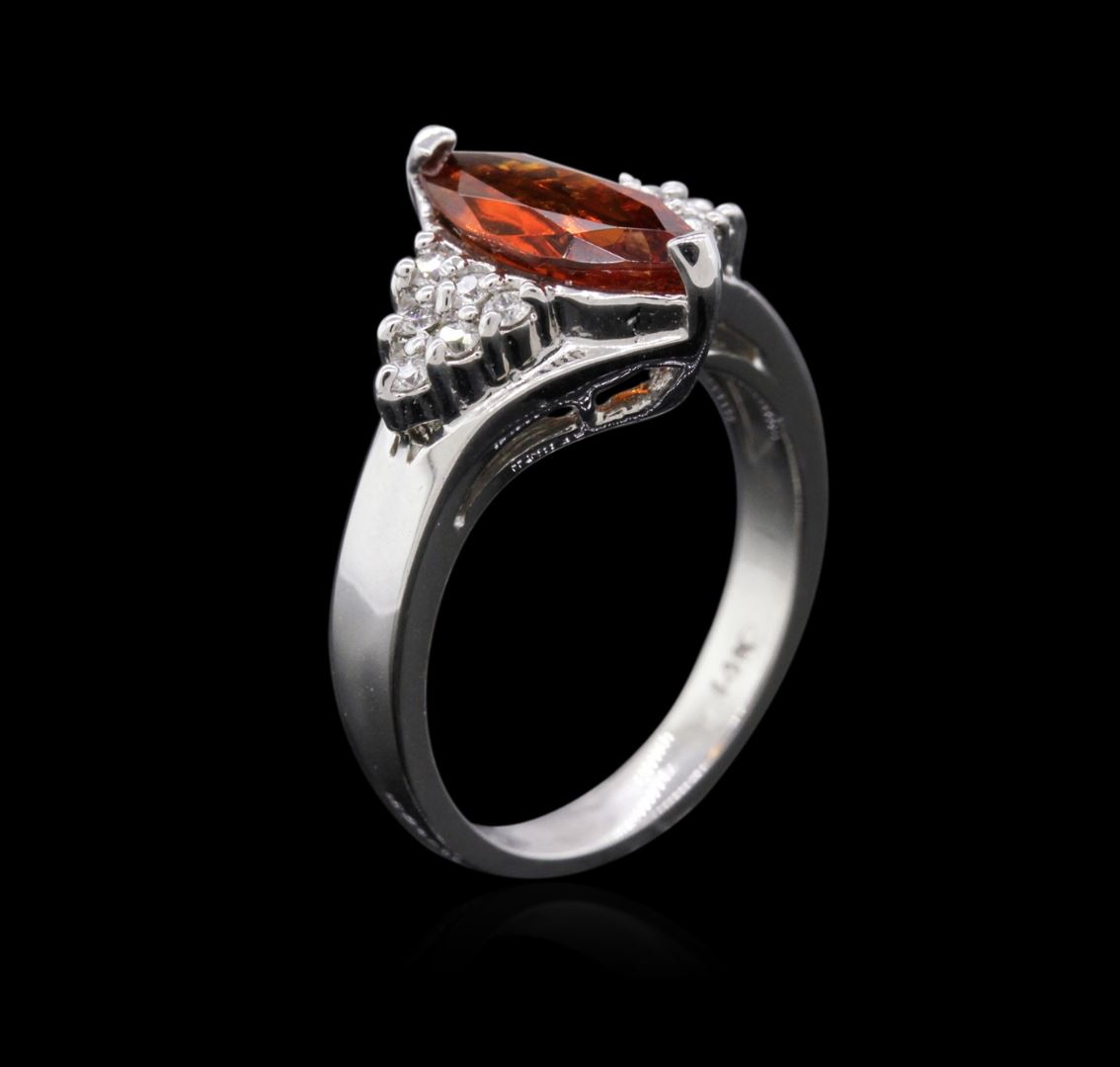 One electronically tested 14KT white gold ladies combination cast & assembled garnet and diamond ring with a flat shank with a bright polish finish. Identified with markings of "14KT". Condition is new. Containing: One prong set marquise modified step cut natural malaya garnet, measuring 12.00 x 5.60 x 3.64mm, approximate weight of 1.78ct., clarity is slightly included, type II, medium, moderately strong, orange color, (GIA O 5/4), cut is good. Twelve prong set round brilliant cut diamonds, measuring 1.30 - 1.30 x 0.78mm (depth est.) approximate total weight of 12 Stones = 0.10ct. Clarity: SI-2 to I-1. Color: I - J, Cut is Good. All diamonds and colored gemstones are graded in the mounting, unless otherwise stated. Colored gemstones are presumed to have been subjected to commonly used enhancement processes. Total Weight of Colored Stones 1.78ct. Total Weight of Diamonds 0.10ct. Total Weight of Ring 5.40 grams. GGL Appraised at $3,070.00.