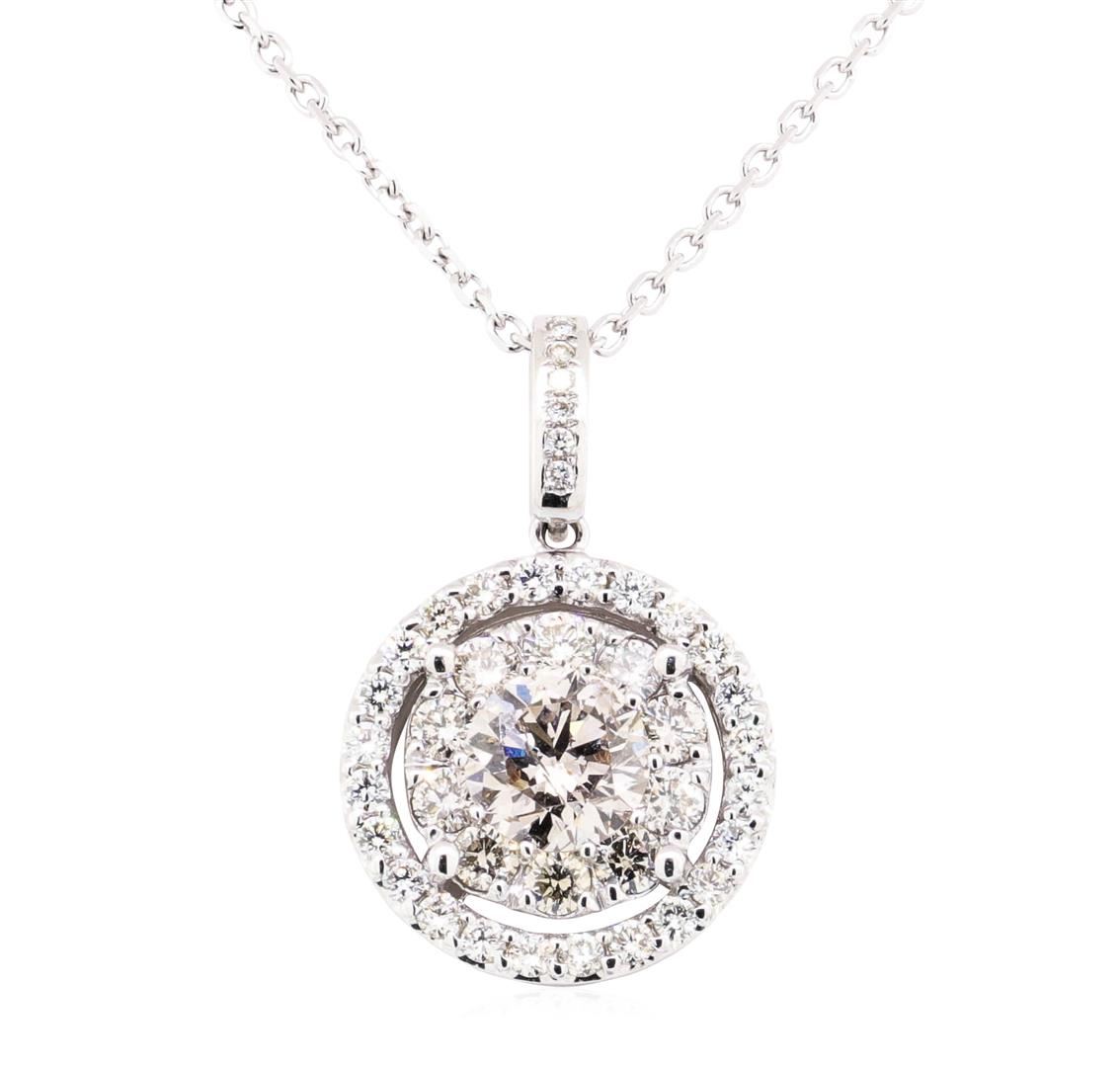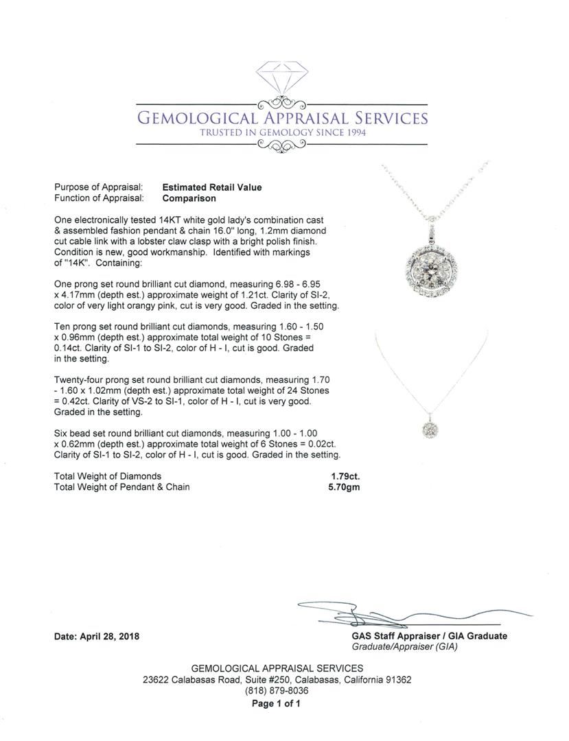 One electronically tested 14KT white gold Ladies combination cast & assembled fashion pendant & chain 16.0' long, 1.2mm diamond cut cable link with a lobster claw clasp with a bright polish finish. Identified with markings of '14K'. Condition is new, good workmanship. Containing: One prong set round brilliant cut diamond, measuring 6.98 - 6.95 x 4.17mm (depth est.) approximate weight of 1.21ct. Graded in the setting. Color Very Light Orangy Pink Clarity SI-2 Cut Very Good Ten prong set round brilliant cut diamonds, measuring 1.60 - 1.50 x 0.96mm (depth est.) approximate total weight of 10 Stones = 0.14ct. Graded in the setting. Color H - I Clarity SI-1 to SI-2 Cut Good Twenty-Four prong set round brilliant cut diamonds, measuring 1.70 - 1.60 x 1.02mm (depth est.) approximate total weight of 24 Stones = 0.42ct. Graded in the setting. Color H - I Clarity VS-2 to SI-1 Cut Very Good Six bead set round brilliant cut diamonds, measuring 1.00 - 1.00 x 0.62mm (depth est.) approximate total weight of 6 Stones = 0.02ct. Graded in the setting. Color H - I Clarity SI-1 to SI-2 Cut Good. Total Weight of Diamonds 1.79ct.. Total Weight of Pendant & Chain 5.70gm. GAS Appraised.