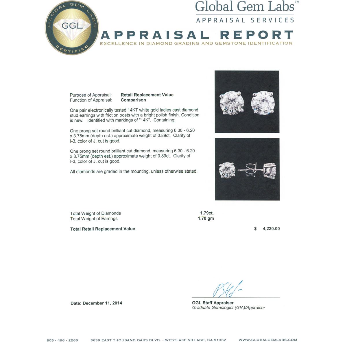 One pair electronically tested 14KT white gold ladies cast diamond stud earrings with friction posts with a bright polish finish. Identified with markings of "14K". Condition is new. Containing: One prong set round brilliant cut diamond, measuring 6.30 - 6.20 x 3.75mm (depth est.) approximate weight of 0.89ct. Clarity: I-3. Color: J, Cut is Good. One prong set round brilliant cut diamond, measuring 6.30 - 6.20 x 3.75mm (depth est.) approximate weight of 0.89ct. Clarity: I-3. Color: J, Cut is Good. All diamonds are graded in the mounting, unless otherwise stated. Total Weight of Diamonds 1.79ct. Total Weight of Earrings 1.70 grams. GGL Appraised at $4,230.00.