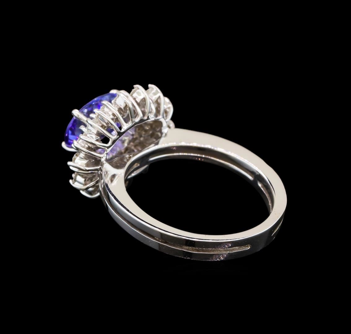 One electronically tested 14KT white gold ladies cast tanzanite and diamond ring with a bright polish finish. Identified with markings of "K14". Condition is new. Containing: One prong set oval modified brilliant cut natural tanzanite, measuring 8.90 x 6.80 x 4.20mm, approximate weight of 1.79ct., clarity is eye clean, type I, medium light, very slightly grayish, violet color, (GIA V 4/3), cut is good. Forty-Two prong set round brilliant cut diamonds, measuring 1.50 - 1.30 x 0.84mm (depth est.) approximate total weight of 42 Stones = 0.42ct. Clarity: SI-1 to SI-2. Color: H - I, Cut is Good. Colored gemstones are presumed to have been subjected to commonly used enhancement processes. All diamonds and colored gemstones are graded in the mounting, unless otherwise stated. Total Weight of Colored Stones 1.79ct. Total Weight of Diamonds 0.42ct. Total Weight of Ring 5.10 grams. GGL Appraised at $3,705.00.