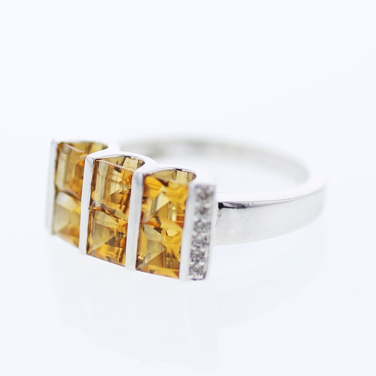 One 14KT White Gold 1.79ctw Citrine and Diamond Ring. (6) Citrine stones with a total weight of 1.89cts. (12) Diamonds with a total weight of 0.09cts. Total weight of this ring is 5.25 grams.