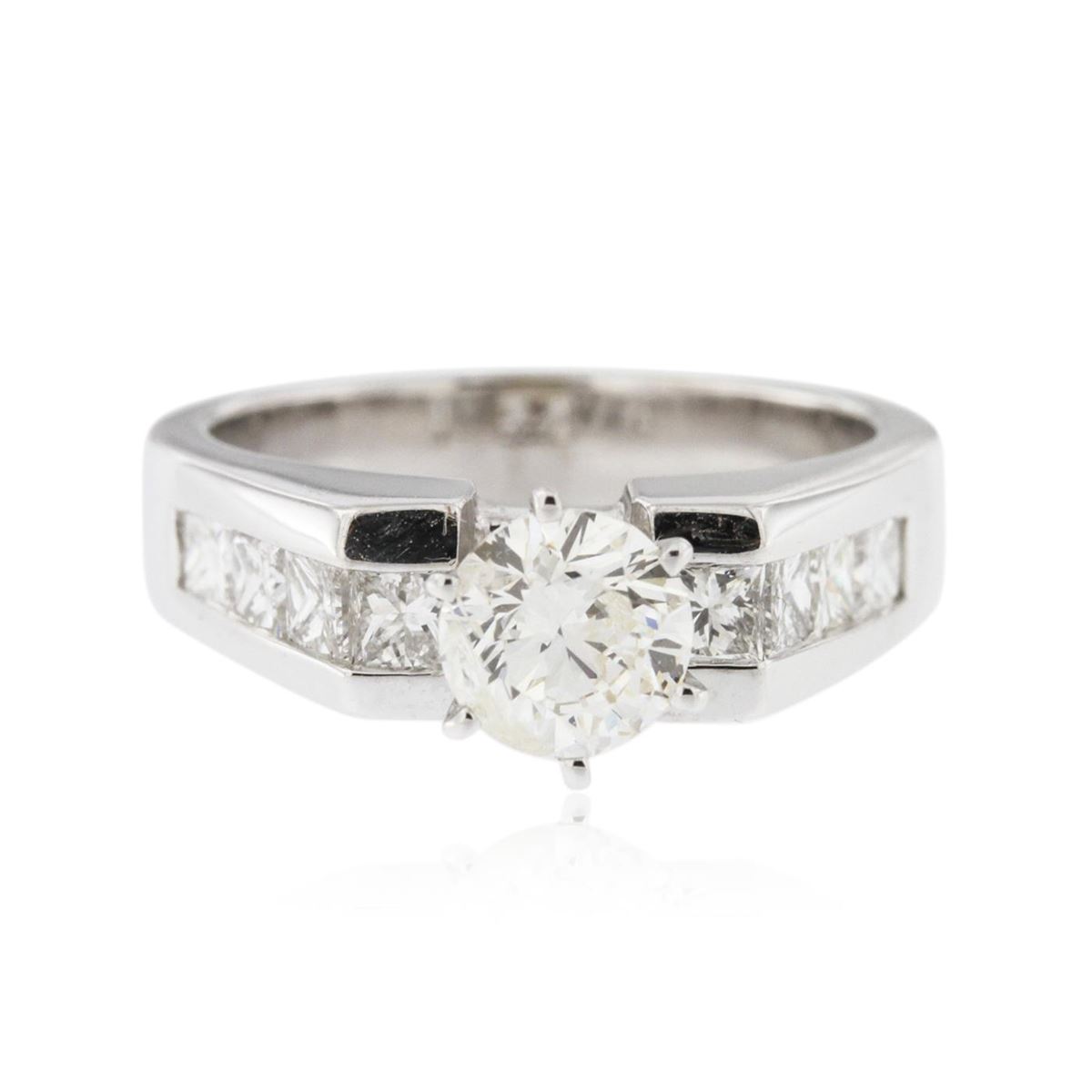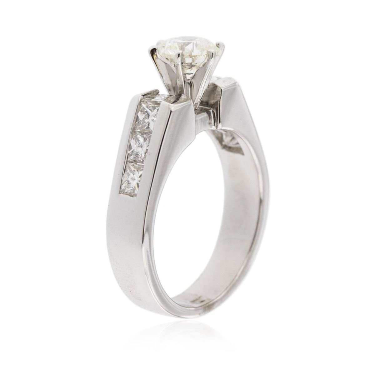 One electronically tested 14KT white gold ladies cast & assembled diamond unity ring with a bright polish finish. Condition is new, good workmanship. The featured diamond is supported by diamond set shoulders and completed by a four millimeter wide band. Identified with markings of "14K". Containing: One prong set round brilliant cut diamond, measuring 6.00 - 6.00 x 3.60mm (depth est.) approximate weight of 0.89ct with a strong blue fluorescence. Graded in the setting. Clarity: I-1 . Color: 60.0%. Table 56.7%. Eight invisible set princess cut diamonds, measuring 3.10 x 2.50 x 1.88mm (depth est.) approximate. Total Weight of 8 Stones = 0.91ct. Measurements are an average for the group. Graded in the setting. Clarity: VS-2 to SI-2 . Color: G - I. Total Weight of Diamonds 1.80ct.. Total Weight of Ring 6.80 grams. AIG Appraised at $9,100.00.
