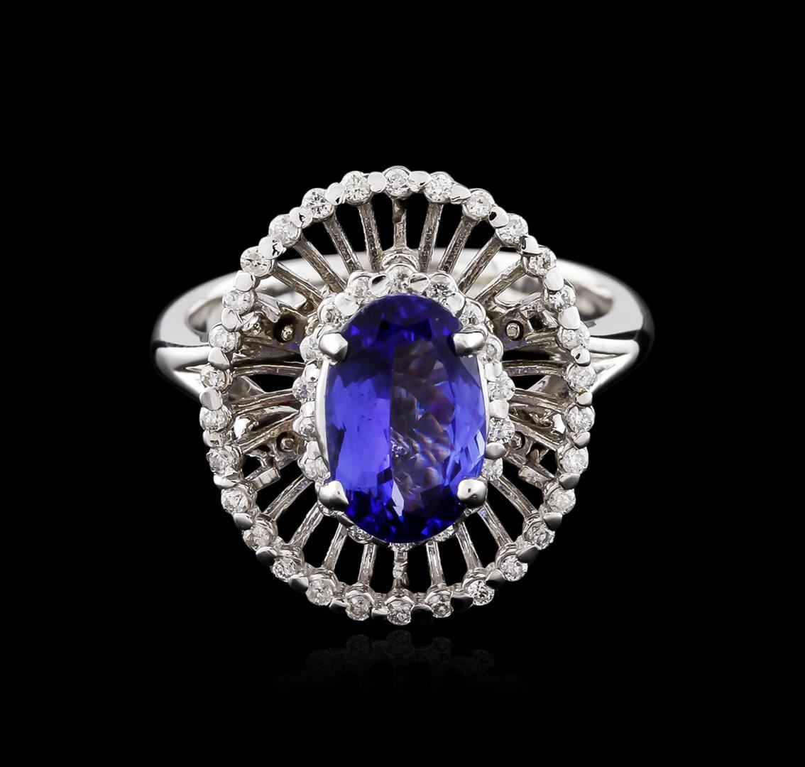 One electronically tested 14KT white gold ladies cast tanzanite and diamond ring with a split shoulder shank with a bright polish finish. Identified with markings of "K14". Condition is new. Containing: One prong set oval modified brilliant cut natural tanzanite, measuring 9.90 x 6.30 x 4.10mm, approximate weight of 1.80ct., clarity is eye clean, type I, medium light, moderately strong, violet color, (GIA V 4/4), cut is good. Forty-Eight prong set round brilliant cut diamonds, measuring 1.10 - 1.10 x 0.66mm (depth est.) approximate total weight of 48 Stones = 0.23ct. Clarity of SI-2 to I-1, Color of I - J, Cut is Good. All diamonds and colored gemstones are graded in the mounting, unless otherwise stated. Colored gemstones are presumed to have been subjected to commonly used enhancement processes. Total Weight of Colored Stones 1.80ct. Total Weight of Diamonds 0.23ct. Total Weight of Ring 6.30 grams. GGL Appraised at $3,810.00.