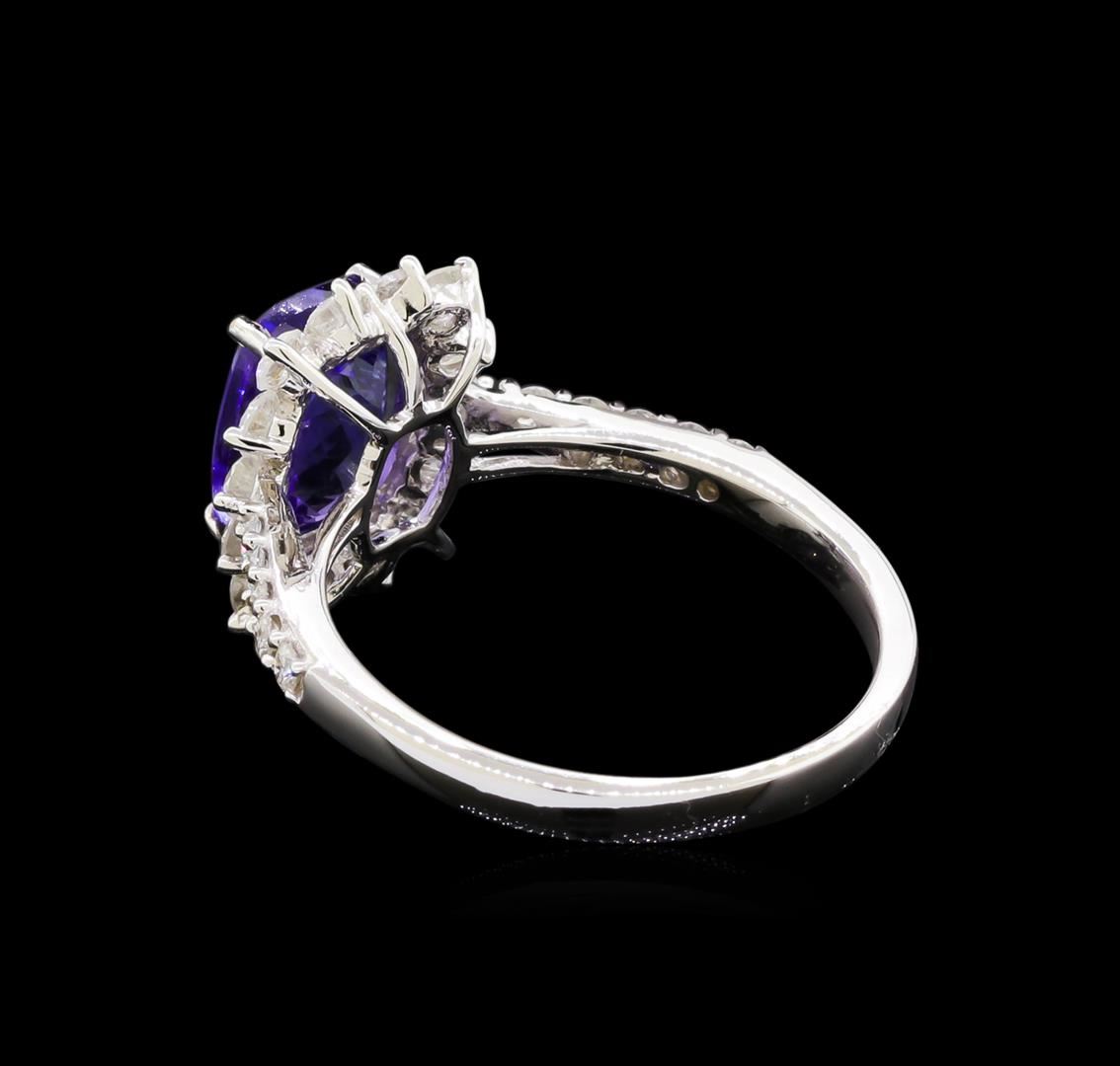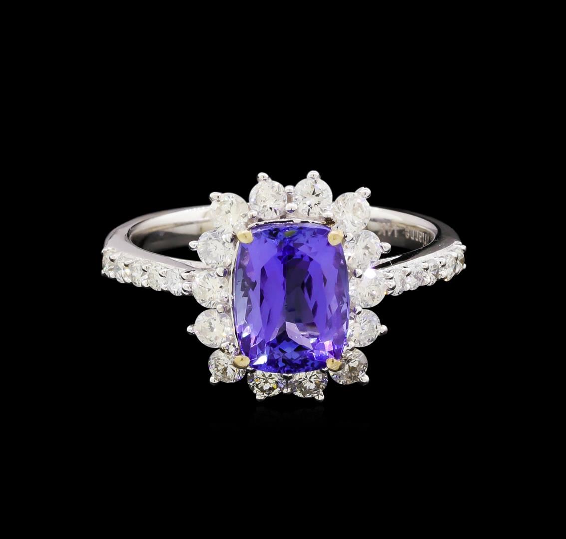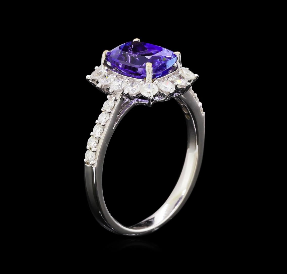 One electronically tested 14KT white gold ladies combination cast & assembled tanzanite and diamond ring with a flat shank with a bright polish finish. Identified with markings of "14K". Condition is new. Containing: One prong set rectangular cushion modified brilliant cut natural tanzanite, measuring 8.56 x 6.53 x 4.08mm, approximate weight of 1.80ct., clarity is eye clean, type I, medium light, moderately strong, violet color, (GIA V 4/4), cut is good. Twenty-Three prong set round brilliant cut diamonds, measuring 2.30 - 1.50 x 1.14mm (depth est.) approximate total weight of 23 Stones = 0.58ct. Clarity: SI-2 to I-2. Color: I - J, Cut is Good. Colored gemstones are presumed to have been subjected to commonly used enhancement processes. All diamonds and colored gemstones are graded in the mounting, unless otherwise stated. Total Weight of Colored Stones 1.80ct. Total Weight of Diamonds 0.58ct. Total Weight of Ring 3.30 grams. GGL Appraised at $4,920.00.