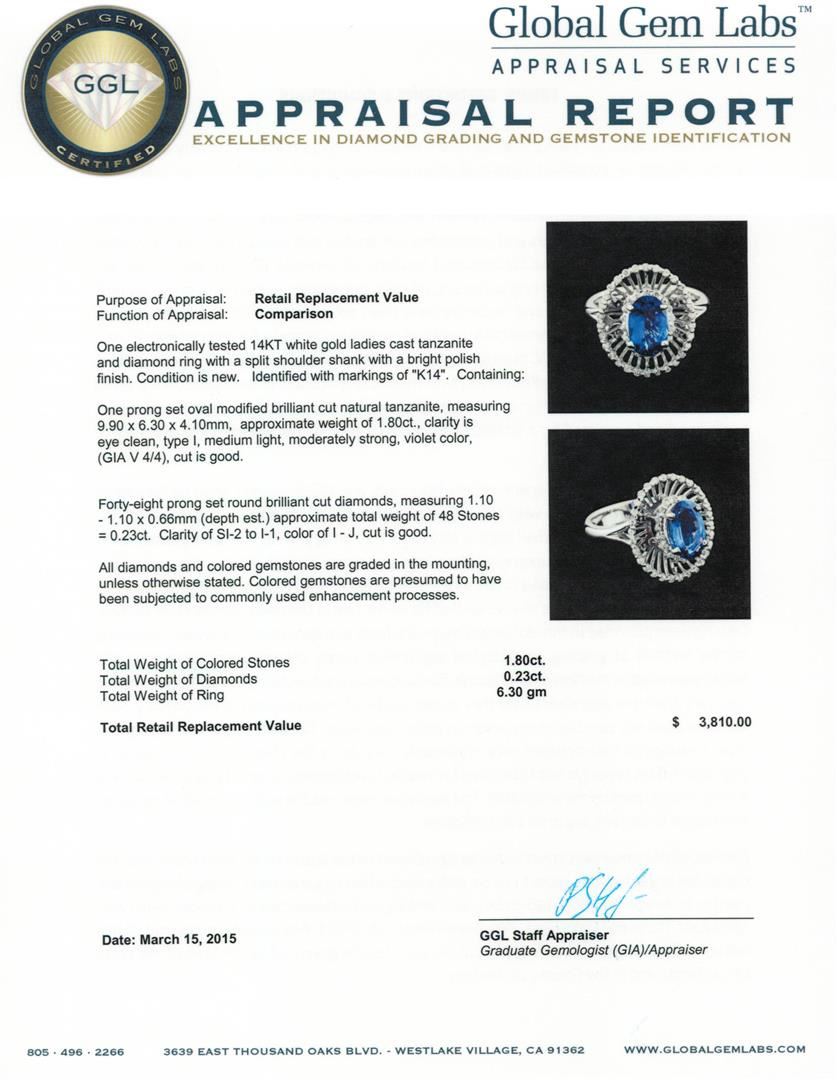 One electronically tested 14KT white gold ladies cast tanzanite and diamond ring with a split shoulder shank with a bright polish finish. Identified with markings of "K14". Condition is new. Containing: One prong set oval modified brilliant cut natural tanzanite, measuring 9.90 x 6.30 x 4.10mm, approximate weight of 1.80ct., clarity is eye clean, type I, medium light, moderately strong, violet color, (GIA V 4/4), cut is good. Forty-Eight prong set round brilliant cut diamonds, measuring 1.10 - 1.10 x 0.66mm (depth est.) approximate total weight of 48 Stones = 0.23ct. Clarity of SI-2 to I-1, Color of I - J, Cut is Good. All diamonds and colored gemstones are graded in the mounting, unless otherwise stated. Colored gemstones are presumed to have been subjected to commonly used enhancement processes. Total Weight of Colored Stones 1.80ct. Total Weight of Diamonds 0.23ct. Total Weight of Ring 6.30 grams. GGL Appraised at $3,810.00.