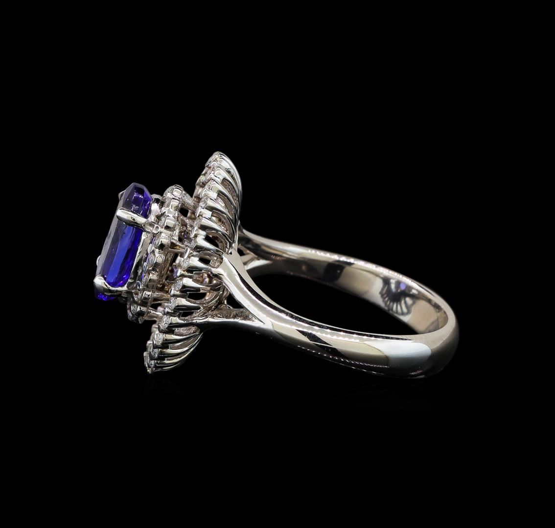 One electronically tested 14KT white gold ladies cast tanzanite and diamond ring with a split shoulder shank with a bright polish finish. Identified with markings of "K14". Condition is new. Containing: One prong set oval modified brilliant cut natural tanzanite, measuring 9.90 x 6.30 x 4.10mm, approximate weight of 1.80ct., clarity is eye clean, type I, medium light, moderately strong, violet color, (GIA V 4/4), cut is good. Forty-Eight prong set round brilliant cut diamonds, measuring 1.10 - 1.10 x 0.66mm (depth est.) approximate total weight of 48 Stones = 0.23ct. Clarity of SI-2 to I-1, Color of I - J, Cut is Good. All diamonds and colored gemstones are graded in the mounting, unless otherwise stated. Colored gemstones are presumed to have been subjected to commonly used enhancement processes. Total Weight of Colored Stones 1.80ct. Total Weight of Diamonds 0.23ct. Total Weight of Ring 6.30 grams. GGL Appraised at $3,810.00.