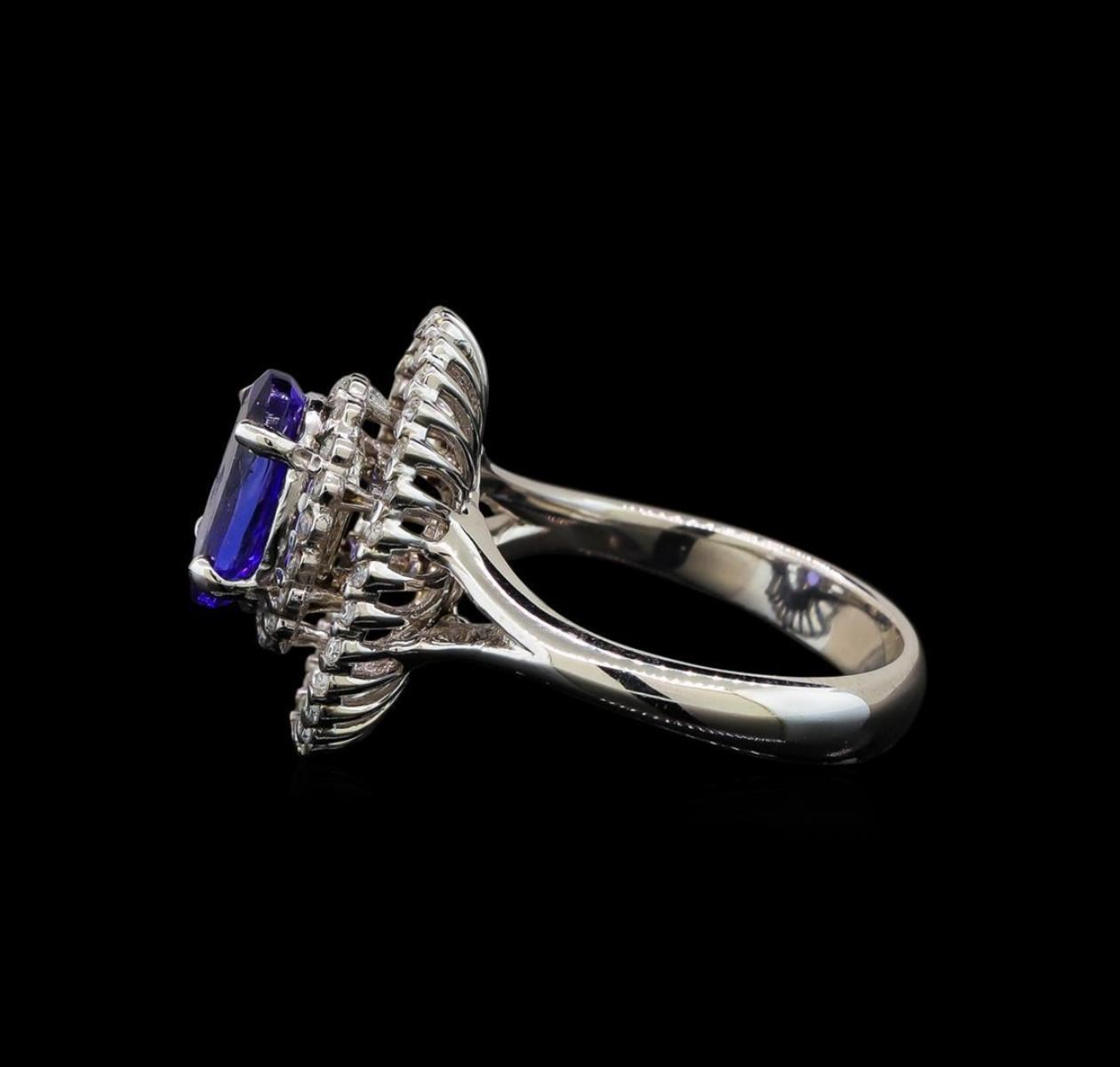 One electronically tested 14KT white gold ladies cast tanzanite and diamond ring with a split shoulder shank with a bright polish finish. Identified with markings of "K14". Condition is new. Containing: One prong set oval modified brilliant cut natural tanzanite, measuring 9.90 x 6.30 x 4.10mm, approximate weight of 1.80ct., clarity is eye clean, type I, medium light, moderately strong, violet color, (GIA V 4/4), cut is good. Forty-Eight prong set round brilliant cut diamonds, measuring 1.10 - 1.10 x 0.66mm (depth est.) approximate total weight of 48 Stones = 0.23ct. Clarity of SI-2 to I-1, Color of I - J, Cut is Good. All diamonds and colored gemstones are graded in the mounting, unless otherwise stated. Colored gemstones are presumed to have been subjected to commonly used enhancement processes. Total Weight of Colored Stones 1.80ct. Total Weight of Diamonds 0.23ct. Total Weight of Ring 6.30 grams. GGL Appraised.