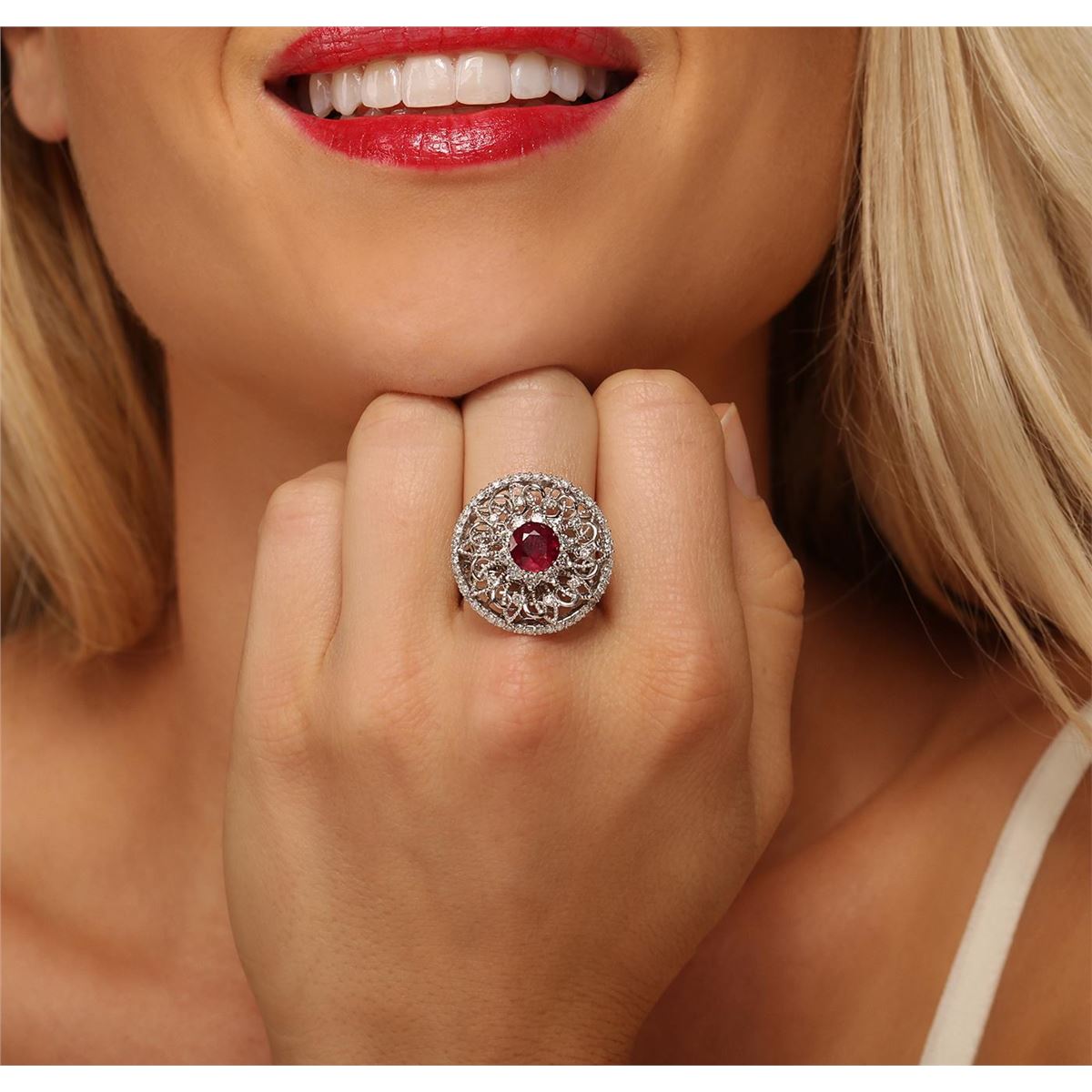 One electronically tested 14KT white gold ladies cast & assembled ruby & diamond ring with a bright & patterned finish. The featured ruby is set within an elaborate white gold lattice set throughout with diamonds, framed by a diamond bezel, supported by a honeycomb lattice under gallery, completed by a three millimeter wide band. Identified with markings of "585". Condition is new, good workmanship. Containing: One prong set round mixed cut natural ruby, measuring 7.15 - 7.14 x 4.00. mm, 10%. bulge factor, approximate weight of 1.80ct., clarity is heavily included, type II, dark, slightly brownish, red color, (GIA R 7/2), cut is good. Transmitting light somewhat diffusely, transparent to translucent. Naturally occurring internal & external characteristics are present. Indications of laboratory high temperature heat treatment, with glass & flux additives. Graded in the setting. Ruby has a low tolerance to rhodium plating, repolishing the surface, & ultrasonic cleaning. Ten prong set round brilliant cut diamonds, measuring 2.55 - 2.50 x 1.54mm (depth est.) approximate total weight of 10 Stones = 0.60ct. Graded in the setting. Clarity: SI-1 to I-1 . Color: G - I Fifty-Eight prong set round brilliant cut diamonds, measuring 1.40 - 1.35 x 0.84mm (depth est.) approximate total weight of 58 Stones = 0.56ct. Graded in the setting. Clarity: SI-2 to I-1 . Color: G - I. Total Weight of Colored Stones 1.80ct. Total Weight of Diamonds 1.16ct. Total Weight of Ring 9.18 grams. AIG Appraised at $3,700.00.