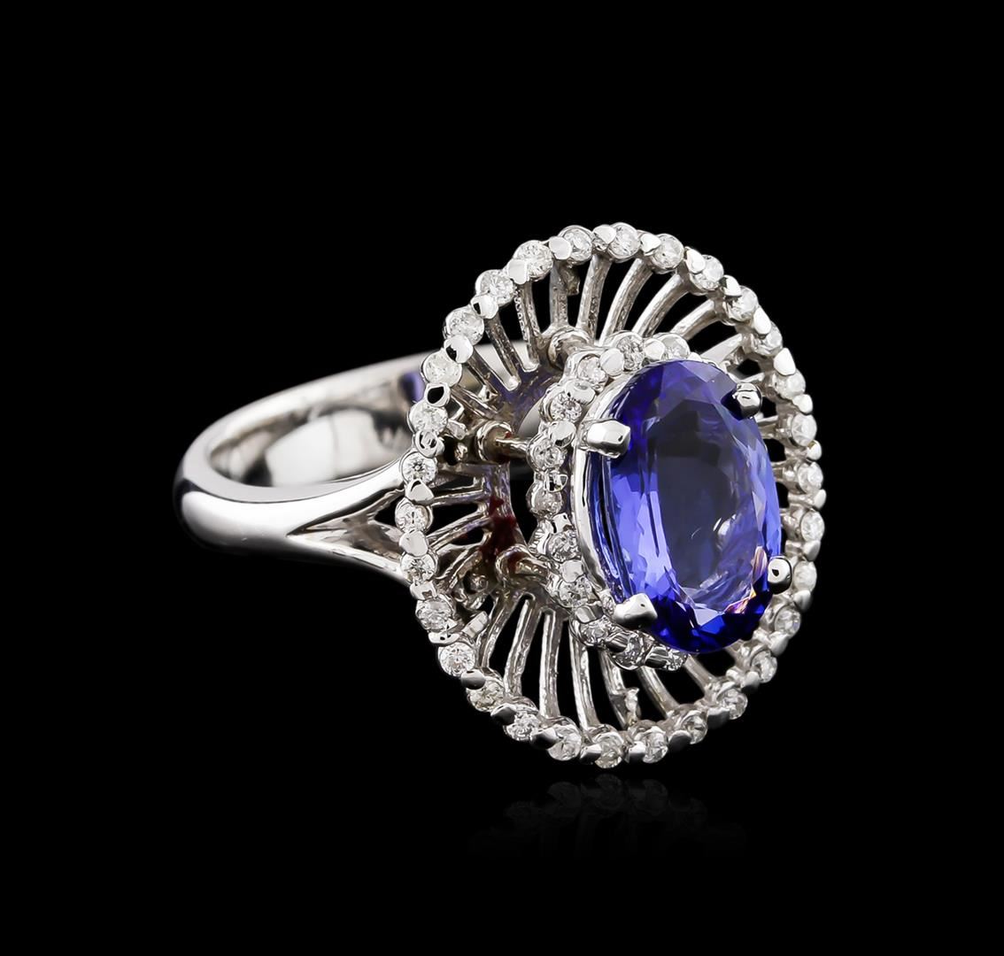 One electronically tested 14KT white gold ladies cast tanzanite and diamond ring with a split shoulder shank with a bright polish finish. Identified with markings of "K14". Condition is new. Containing: One prong set oval modified brilliant cut natural tanzanite, measuring 9.90 x 6.30 x 4.10mm, approximate weight of 1.80ct., clarity is eye clean, type I, medium light, moderately strong, violet color, (GIA V 4/4), cut is good. Forty-Eight prong set round brilliant cut diamonds, measuring 1.10 - 1.10 x 0.66mm (depth est.) approximate total weight of 48 Stones = 0.23ct. Clarity of SI-2 to I-1, Color of I - J, Cut is Good. All diamonds and colored gemstones are graded in the mounting, unless otherwise stated. Colored gemstones are presumed to have been subjected to commonly used enhancement processes. Total Weight of Colored Stones 1.80ct. Total Weight of Diamonds 0.23ct. Total Weight of Ring 6.30 grams. GGL Appraised at $3,810.00.