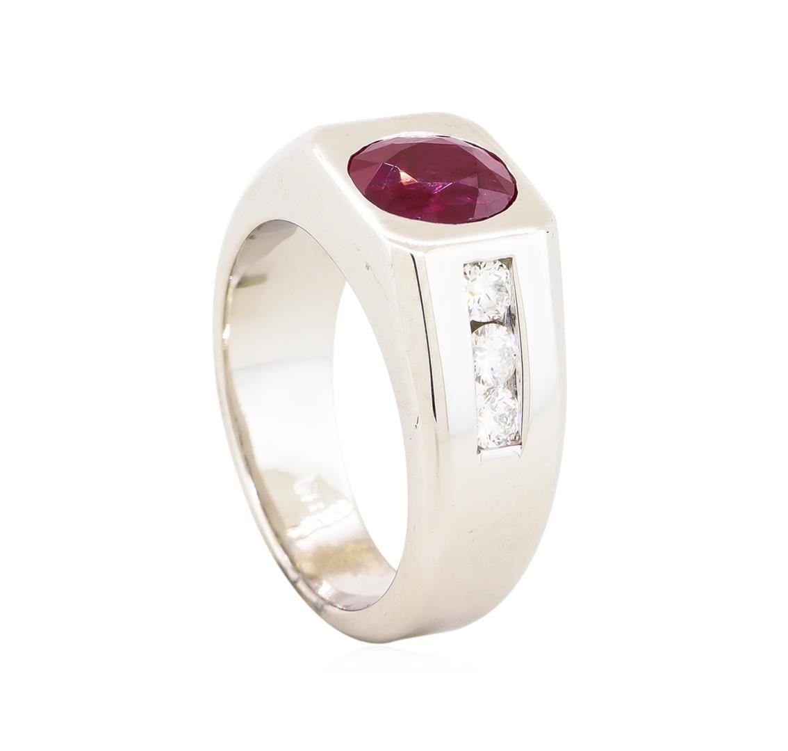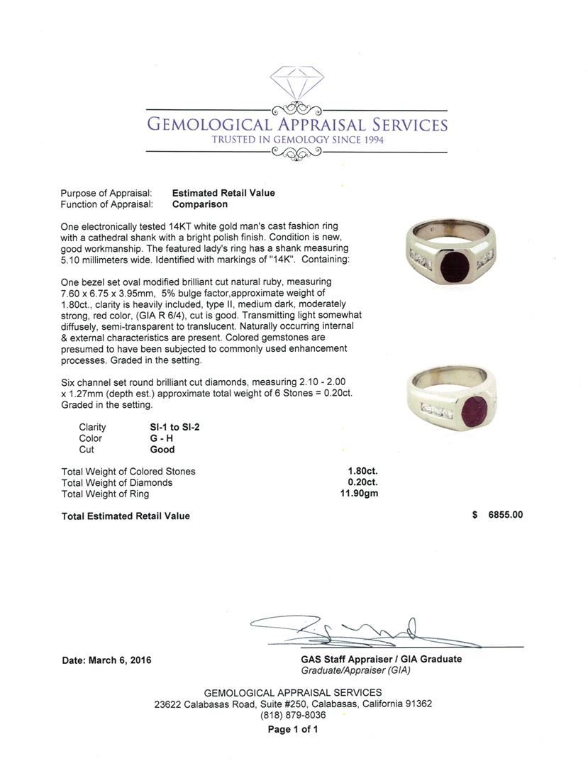 One electronically tested 14KT white gold man's cast fashion ring with a cathedral shank with a bright polish finish. The featured lady's ring has a shank measuring 5.10 millimeters wide. Identified with markings of "14K". Condition is new, good workmanship. Containing: One bezel set oval modified brilliant cut natural ruby, measuring 7.60 x 6.75 x 3.95mm, 5%. bulge factor, approximate weight of 1.80ct., clarity is heavily included, type II, medium dark, moderately strong, red color, (GIA R 6/4), Cut is good. Transmitting light somewhat diffusely, semi-transparent to translucent. Naturally occurring internal & external characteristics are present. Colored gemstones are presumed to have been subjected to commonly used enhancement processes. Graded in the setting. Six channel set round brilliant cut diamonds, measuring 2.10 - 2.00 x 1.27mm (depth est.) approximate. Total Weight of 6 Stones = 0.20ct. Graded in the setting. Clarity: SI-1 to SI-2. Color: G - H, Cut Good. Total Weight of Colored Stones 1.80ct. Total Weight of Diamonds 0.20ct. Total Weight of Ring 11.90gm. GAS Appraised at $6,855.00.