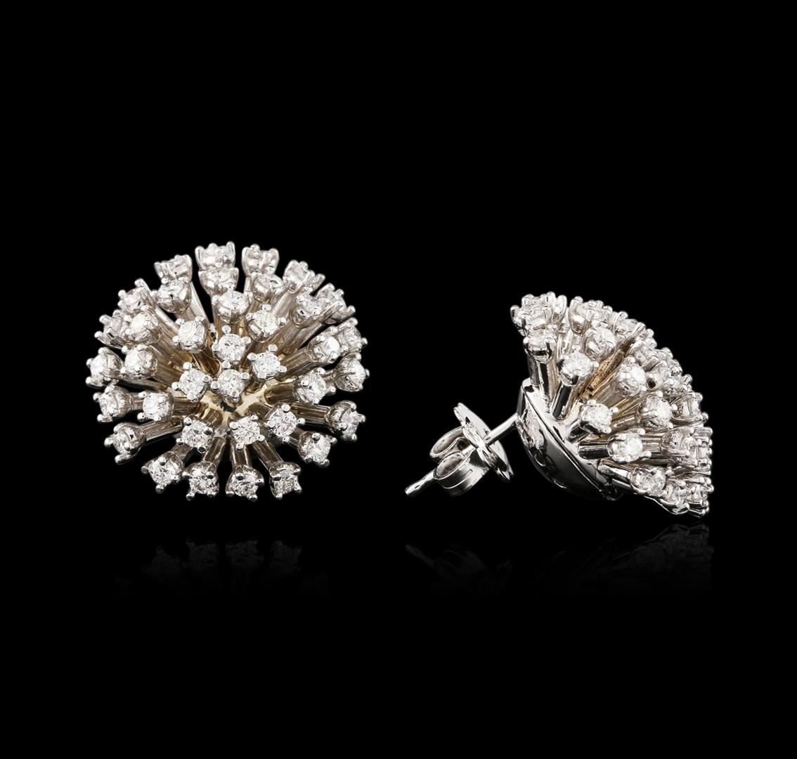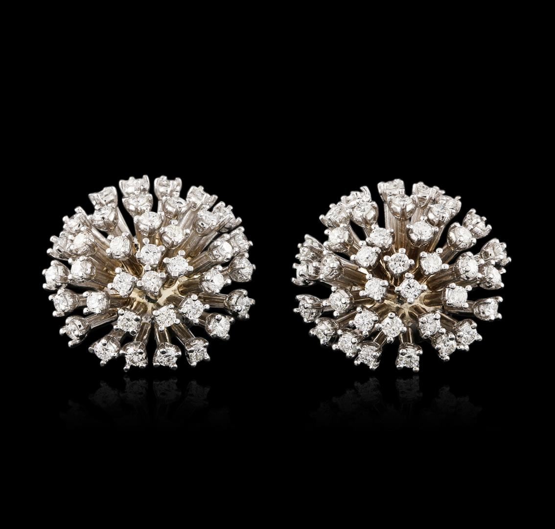 One pair electronically tested 14KT white gold ladies cast & assembled diamond earrings with standard backs. Each earring features a stylized arrangement of independently moving diamond set bursts. Bright polish finish. Identified with markings of "14K". Condition is new, good workmanship. Containing: Seventy-Four prong set round brilliant cut diamonds, measuring 1.90 - 1.80 x 1.11mm (depth est.) approximate total weight of 74 Stones = 1.81ct. Graded in the setting. Clarity: VS-2 to SI-2. Color: G - I. Total Weight of Diamonds 1.81ct. Total Weight of Earrings 16.67 grams. AIG Appraised at $8,500.00.