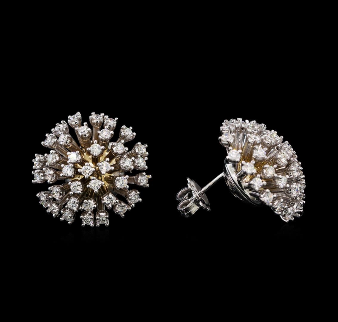 One pair electronically tested 14KT white gold ladies cast & assembled diamond earrings with standard backs. Each earring features a stylized arrangement of independently moving diamond set bursts. Bright polish finish. Identified with markings of "14K". Condition is new, good workmanship. Containing: Seventy-Four prong set round brilliant cut diamonds, measuring 1.90 - 1.80 x 1.11mm (depth est.) approximate total weight of 74 Stones = 1.81ct. Graded in the setting. Clarity: VS-2 to SI-2. Color: G - I. Total Weight of Diamonds 1.81ct. Total Weight of Earrings 16.67 grams. AIG Appraised at $8,500.00.