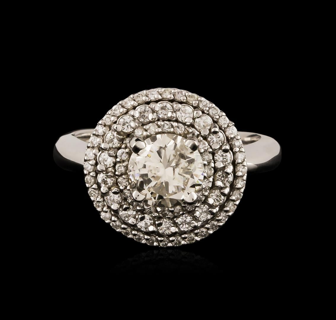 One electronically tested 14KT white gold ladies cast diamond ring with a bright polish finish. The featured diamond is set within tiered diamond bezels, completed by a two millimeter wide band. Identified with markings of "K14". Condition is new, good workmanship. Containing: One prong set round brilliant cut diamond, measuring 6.52 - 6.46 x 4.02mm (depth est.), 6.00.% GTCF approximate weight of 1.11ct with a medium blue fluorescence. Faint brown secondary color throughout. Graded in the setting. Clarity: I-1. Color: K. Depth 61.9%. Table 70.9%. Seventy-Four prong set round brilliant cut diamonds, measuring 1.50 - 1.20 x 0.81mm (depth est.) approximate total weight of 74 Stones = 0.70ct. Graded in the setting. Clarity: SI-2 to I-1. Color: G - I. Total Weight of Diamonds 1.81ct. Total Weight of Ring 6.12 grams. AIG Appraised at $13,420.00.