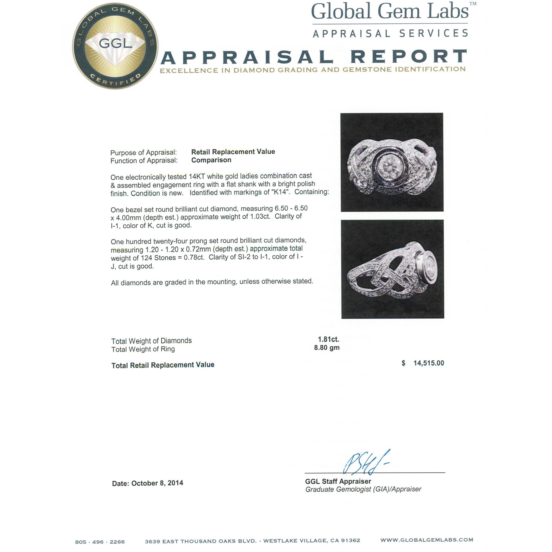 One electronically tested 14KT white gold ladies combination cast & assembled engagement ring with a flat shank with a bright polish finish. Identified with markings of "K14". Condition is new. Containing: One bezel set round brilliant cut diamond, measuring 6.50 - 6.50 x 4.00mm (depth est.) approximate weight of 1.03ct. Clarity: I-1. Color: K, Cut is Good. One Hundred Twenty-Four prong set round brilliant cut diamonds, measuring 1.20 - 1.20 x 0.72mm (depth est.) approximate total weight of 124 Stones = 0.78ct. Clarity: SI-2 to I-1. Color: I - J, Cut is Good. All diamonds are graded in the mounting, unless otherwise stated. Total Weight of Diamonds 1.81ct. Total Weight of Ring 8.80 grams. GGL Appraised at $14,515.00.