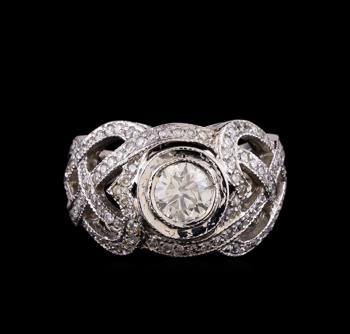 One electronically tested 14KT white gold ladies combination cast & assembled engagement ring with a flat shank with a bright polish finish. Identified with markings of "K14". Condition is new. Containing: One bezel set round brilliant cut diamond, measuring 6.50 - 6.50 x 4.00mm (depth est.) approximate weight of 1.03ct. Clarity: I-1. Color: K, Cut is Good. One Hundred Twenty-Four prong set round brilliant cut diamonds, measuring 1.20 - 1.20 x 0.72mm (depth est.) approximate total weight of 124 Stones = 0.78ct. Clarity: SI-2 to I-1. Color: I - J, Cut is Good. All diamonds are graded in the mounting, unless otherwise stated. Total Weight of Diamonds 1.81ct. Total Weight of Ring 8.80 grams. GGL Appraised at $14,515.00.