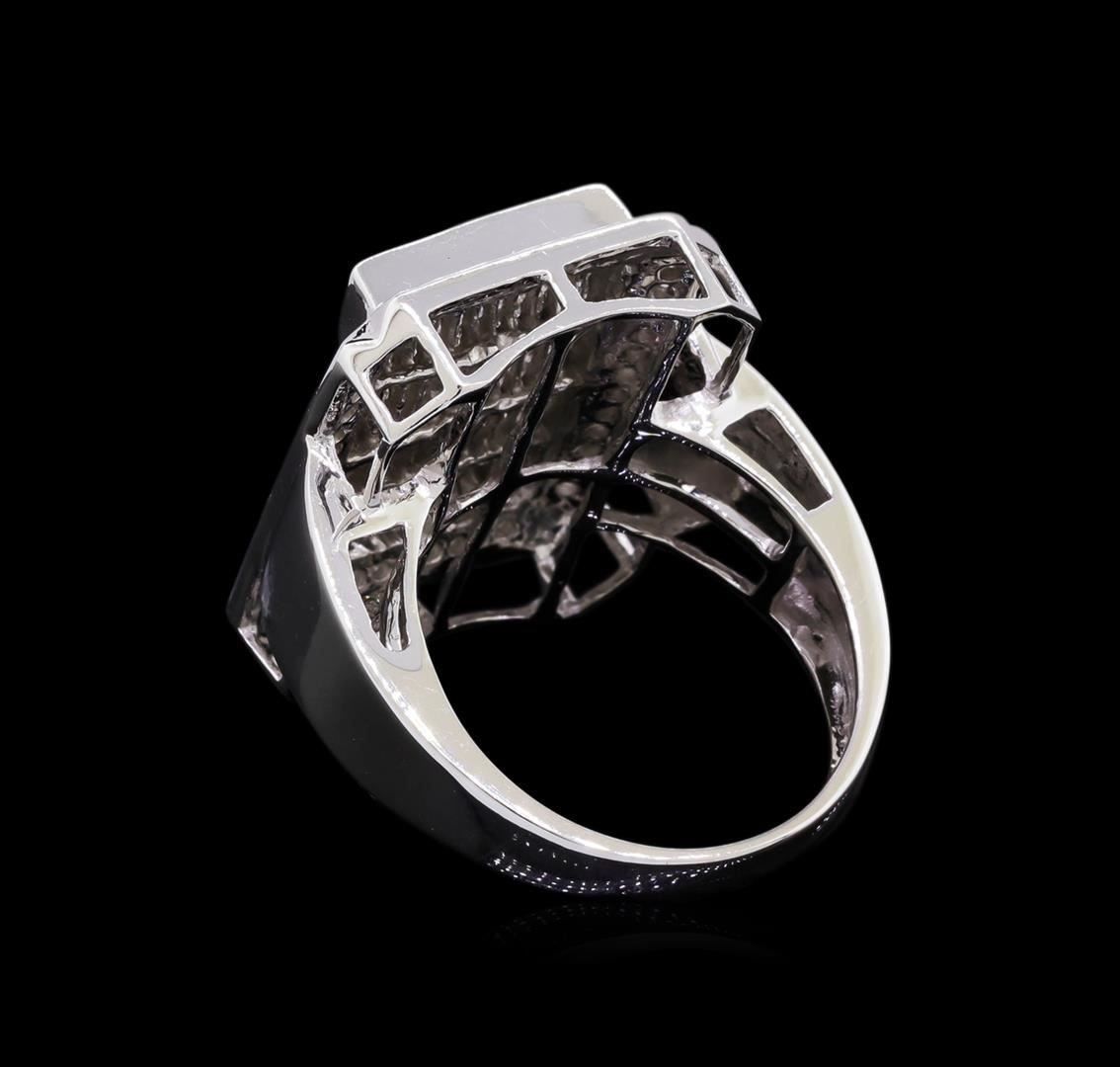 One electronically tested 14KT white gold man's combination cast & assembled ring with a bright polish finish. Condition is new. Identified with markings of "14K". Containing: One Hundred Eighty pave' set princess cut diamonds, measuring 1.10 x 1.10 x 0.83mm (depth est.) approximate. Total Weight of 180 Stones = 1.48ct. Clarity: I-1 to I-2. Color: H - I, Cut is Good. Forty-Two prong set round brilliant cut diamonds, measuring 1.30 - 1.30 x 0.78mm (depth est.) approximate. Total Weight of 42 Stones = 0.34ct. Clarity: I-1 to I-2. Color: H - I, Cut is Good. Total Weight of Diamonds 1.81ct. Total Weight of Ring 12.40gm. GGL Appraised at $8,595.00.
