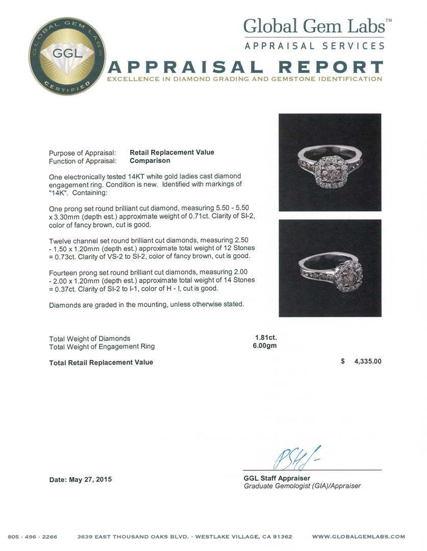 One electronically tested 14KT white gold ladies cast diamond engagement ring. Identified with markings of "14K". Condition is new. Containing: One prong set round brilliant cut diamond, measuring 5.50 - 5.50 x 3.30mm (depth est.) approximate weight of 0.71ct. Clarity: SI-2, Cut is Good. Twelve channel set round brilliant cut diamonds, measuring 2.50 - 1.50 x 1.20mm (depth est.) approximate total weight of 12 Stones = 0.73ct. Clarity: VS-2 to SI-2, Cut is Good. Fourteen prong set round brilliant cut diamonds, measuring 2.00 - 2.00 x 1.20mm (depth est.) approximate total weight of 14 Stones = 0.37ct. Clarity: SI-2 to I-1. Color: H - I, Cut is Good. Diamonds are graded in the mounting, unless otherwise stated. Total Weight of Diamonds 1.81ct. Total Weight of Engagement Ring 6.00 grams. GGL Appraised at $4,335.00.