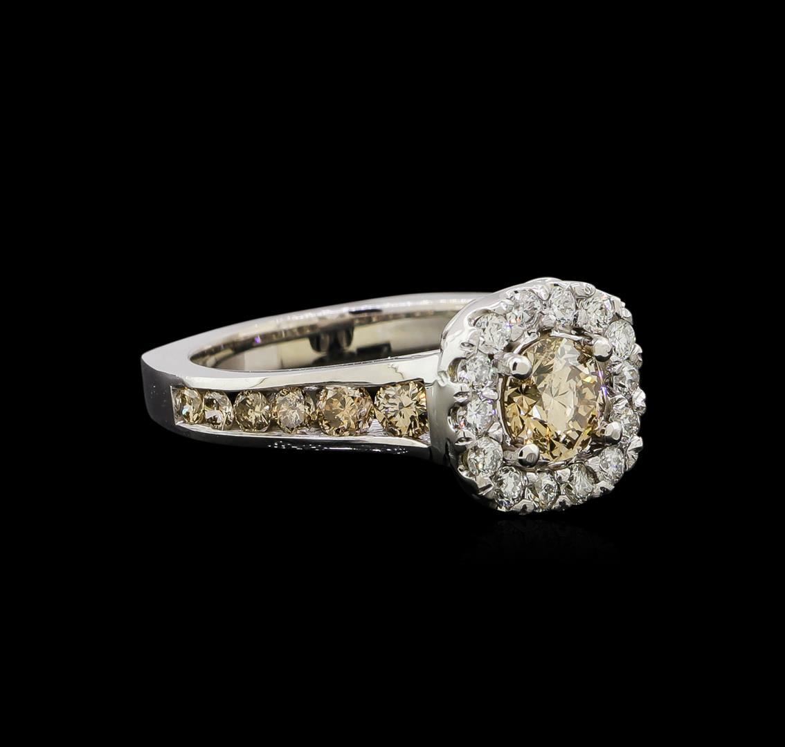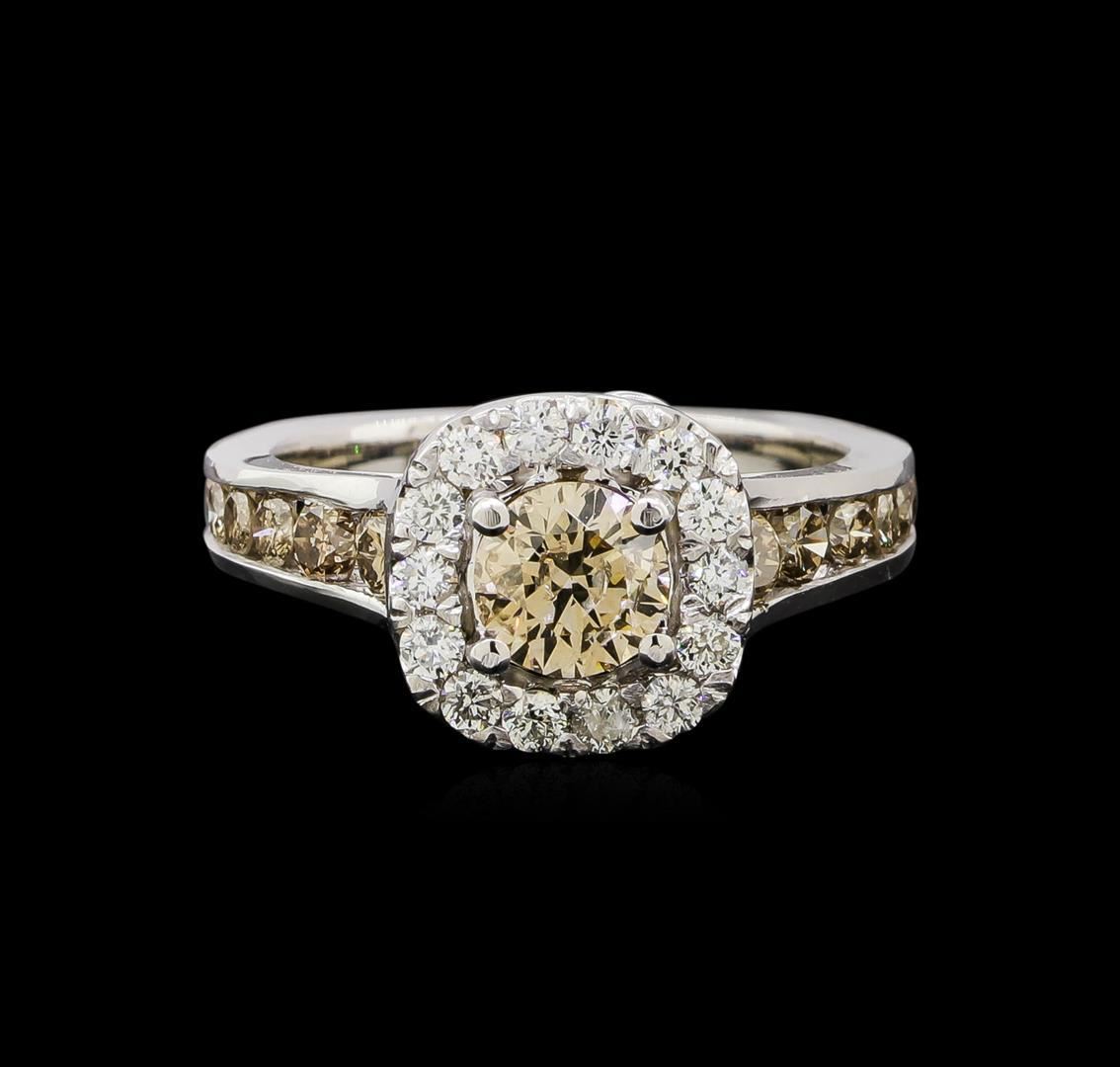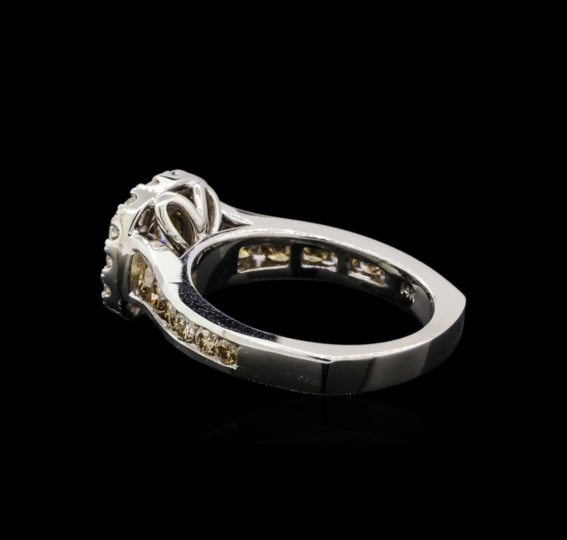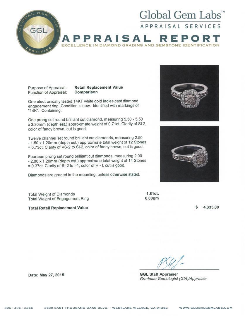 One electronically tested 14KT white gold ladies cast diamond engagement ring. Identified with markings of "14K". Condition is new. Containing: One prong set round brilliant cut diamond, measuring 5.50 - 5.50 x 3.30mm (depth est.) approximate weight of 0.71ct. Clarity: SI-2, Cut is Good. Twelve channel set round brilliant cut diamonds, measuring 2.50 - 1.50 x 1.20mm (depth est.) approximate total weight of 12 Stones = 0.73ct. Clarity: VS-2 to SI-2, Cut is Good. Fourteen prong set round brilliant cut diamonds, measuring 2.00 - 2.00 x 1.20mm (depth est.) approximate total weight of 14 Stones = 0.37ct. Clarity: SI-2 to I-1. Color: H - I, Cut is Good. Diamonds are graded in the mounting, unless otherwise stated. Total Weight of Diamonds 1.81ct. Total Weight of Engagement Ring 6.00 grams. GGL Appraised.
