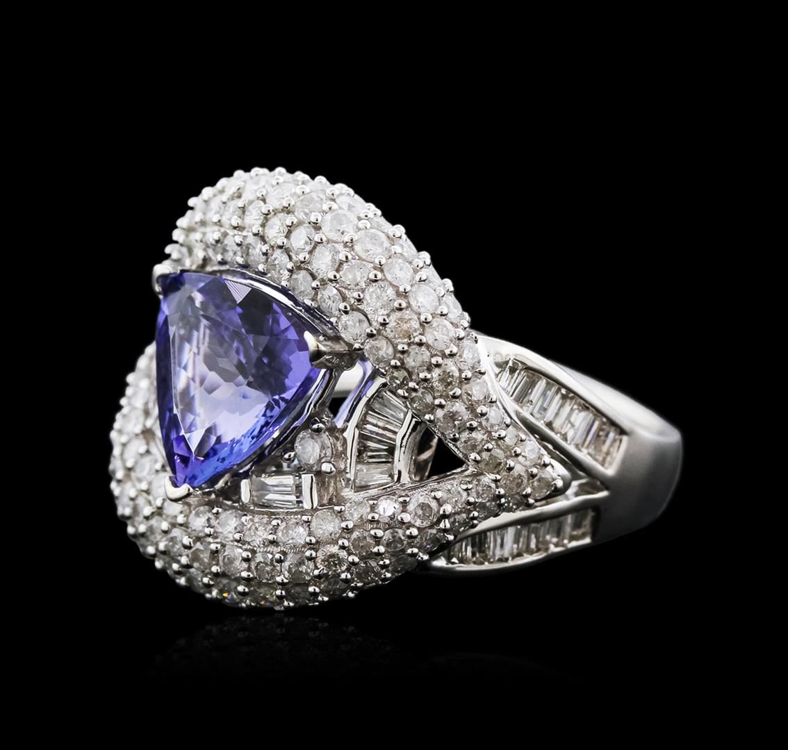 One electronically tested 14KT white gold ladies cast tanzanite and diamond ring with a tapered shank with a bright polish finish. Trademark is Orianne. Identified with markings of "14K". Condition is new. Containing: One prong set triangle modified brilliant cut natural tanzanite, measuring 8.01 x 7.23 x 5.17mm, approximate weight of 1.81ct., clarity is eye clean, type I, medium light, very slightly grayish, bluish violet color, (GIA bV 4/3), cut is good. One Hundred Forty-Six prong set round brilliant cut diamonds, measuring 1.20 - 1.20 x 0.72mm (depth est.) approximate total weight of 146 Stones = 0.92ct. Clarity: I-1 to I-2. Color: I - J. Thirty-Eight channel set baguette cut diamonds, measuring 1.80 x 1.10 x 0.94mm (depth est.) approximate total weight of 38 Stones = 0.65ct. Clarity: SI-1. Color: I - J. Two prong set round brilliant cut diamonds, measuring 1.80 - 1.80 x 1.08mm (depth est.) approximate total weight of 2 Stones = 0.04ct. Clarity: I-1 to I-2. Color: I - J. All diamonds and colored gemstones are graded in the mounting, unless otherwise stated. Colored gemstones are presumed to have been subjected to commonly used enhancement processes. Total Weight of Colored Stones 1.81ct. Total Weight of Diamonds 1.61ct. Total Weight of Ring 7.90 grams. GGL Appraised at $7,415.00.