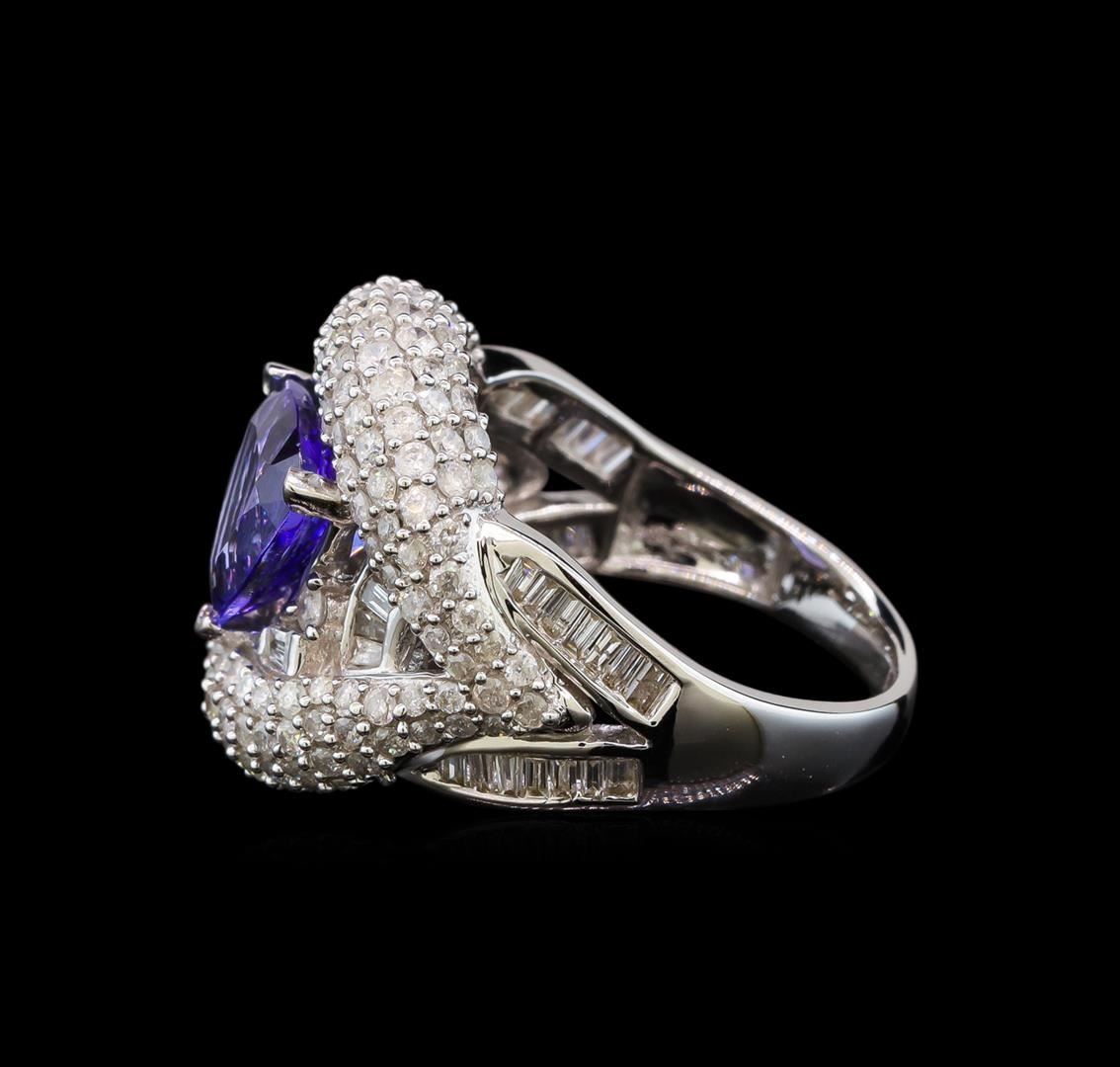 One electronically tested 14KT white gold ladies cast tanzanite and diamond ring with a tapered shank with a bright polish finish. Trademark is Orianne. Identified with markings of "14K". Condition is new. Containing: One prong set triangle modified brilliant cut natural tanzanite, measuring 8.01 x 7.23 x 5.17mm, approximate weight of 1.81ct., clarity is eye clean, type I, medium light, very slightly grayish, bluish violet color, (GIA bV 4/3), cut is good. One Hundred Forty-Six prong set round brilliant cut diamonds, measuring 1.20 - 1.20 x 0.72mm (depth est.) approximate total weight of 146 Stones = 0.92ct. Clarity: I-1 to I-2. Color: I - J. Thirty-Eight channel set baguette cut diamonds, measuring 1.80 x 1.10 x 0.94mm (depth est.) approximate total weight of 38 Stones = 0.65ct. Clarity: SI-1. Color: I - J. Two prong set round brilliant cut diamonds, measuring 1.80 - 1.80 x 1.08mm (depth est.) approximate total weight of 2 Stones = 0.04ct. Clarity: I-1 to I-2. Color: I - J. All diamonds and colored gemstones are graded in the mounting, unless otherwise stated. Colored gemstones are presumed to have been subjected to commonly used enhancement processes. Total Weight of Colored Stones 1.81ct. Total Weight of Diamonds 1.61ct. Total Weight of Ring 7.90 grams. GGL Appraised at $7,415.00.