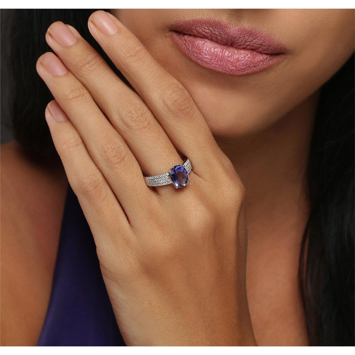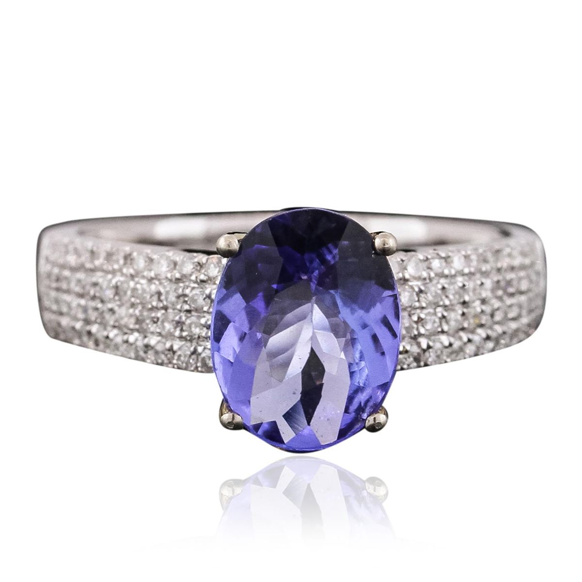 One electronically tested 14KT white gold ladies cast tanzanite and diamond ring. The featured tanzanite is supported by diamond set shoulders, completed by a two and one-half millimeter wide band. Bright polish finish with yellow gold accents. Identified with markings of "14K". Condition is new, good workmanship. Containing: One prong set oval brilliant cut natural tanzanite, measuring 9.60 x 7.45 x 3.50mm, 6% bulge factor, approximate weight of 1.81ct., clarity is eye clean, type I, medium dark, very slightly grayish, bluish violet color, (GIA bV 6/3), cut is good. Transmitting light with no distortion, transparent. Graded in the setting. Tanzanite is a very rare gemstone that is only found in the country of Tanzania. Originally discovered in 1967. Tiffany & Company, named the stone Tanzanite. It is found in the Usumburu Mountains that border the Umba Valley of northern Tanzania. Tanzanite occurs in gray, brown, violet, blue, reddish-purple, & green. The gem is interesting because of its exceptional pleochroism. Rotated in different directions a tanzanite will exhibit multiple changes of color. Tanzanite has a low tolerance to ultrasonic cleaning, and should not be cleaned using this method. Eighty prong set round brilliant cut diamonds, measuring 1.20 - 1.10 x 0.69mm (depth est.) approximate total weight of 80 Stones = 0.54ct. Graded in the setting. Clarity: SI-1 to I-1. Color: G - I. Total Weight of Colored Stones 1.81ct. Total Weight of Diamonds 0.54ct. Total Weight of Ring 3.98 grams. AIG Appraised at $6,225.00.