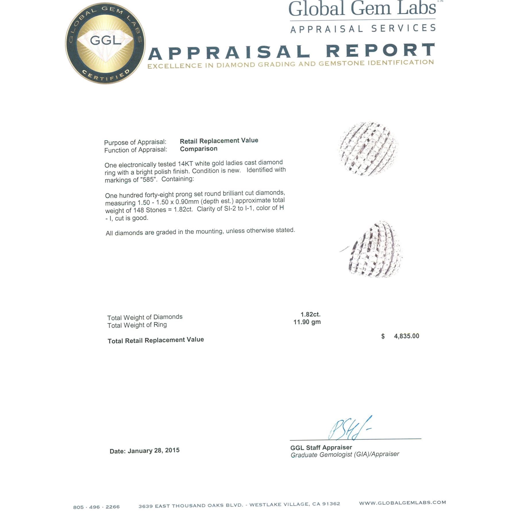 One electronically tested 14KT white gold ladies cast diamond ring with a bright polish finish. Identified with markings of "585". Condition is new. Containing: One Hundred Forty-Eight prong set round brilliant cut diamonds, measuring 1.50 - 1.50 x 0.90mm (depth est.) approximate total weight of 148 Stones = 1.82ct. Clarity: SI-2 to I-1. Color: H - I, Cut is Good. All diamonds are graded in the mounting, unless otherwise stated. Total Weight of Diamonds 1.82ct. Total Weight of Ring 11.90 grams. GGL Appraised at $4,835.00.