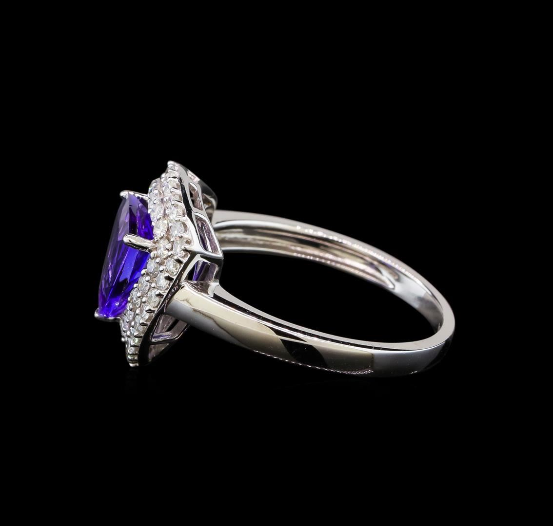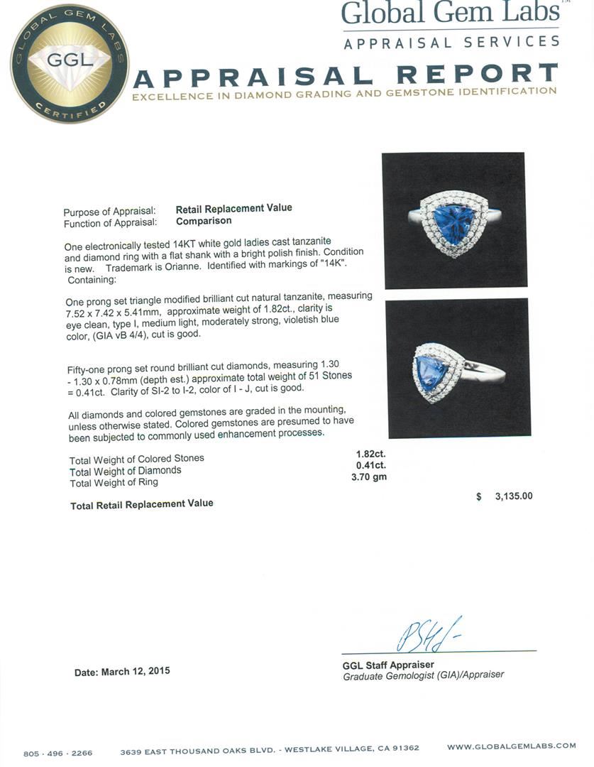One electronically tested 14KT white gold ladies cast tanzanite and diamond ring with a flat shank with a bright polish finish. Trademark is Orianne. Identified with markings of "14K". Condition is new. Containing: One prong set triangle modified brilliant cut natural tanzanite, measuring 7.52 x 7.42 x 5.41mm, approximate weight of 1.82ct., clarity is eye clean, type I, medium light, moderately strong, violetish blue color, (GIA vB 4/4), cut is good. Fifty-One prong set round brilliant cut diamonds, measuring 1.30 - 1.30 x 0.78mm (depth est.) approximate total weight of 51 Stones = 0.41ct. Clarity: SI-2 to I-2. Color: I - J, Cut is Good. All diamonds and colored gemstones are graded in the mounting, unless otherwise stated. Colored gemstones are presumed to have been subjected to commonly used enhancement processes. Total Weight of Colored Stones 1.82ct. Total Weight of Diamonds 0.41ct. Total Weight of Ring 3.70 grams. GGL Appraised at $3,135.00.