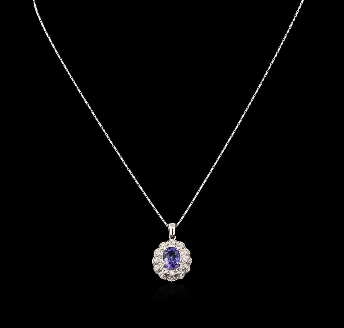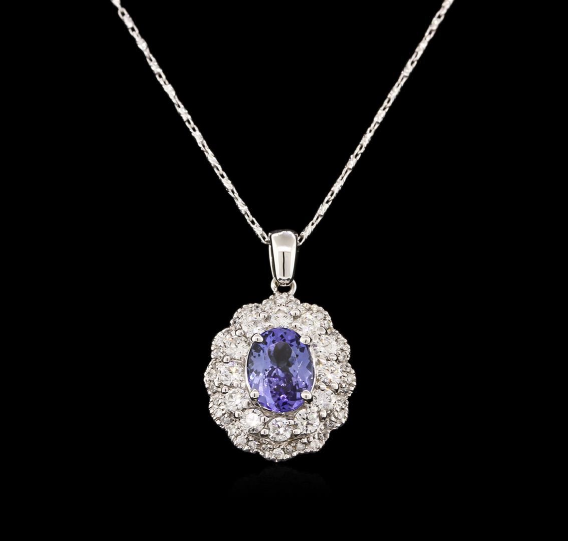 One electronically tested 14KT white gold ladies cast tanzanite and diamond pendant & chain 18.0" long, with a lobster claw clasp with a bright polish finish. Identified with markings of "14K". Condition is new. Containing: One prong set oval modified brilliant cut natural tanzanite, measuring 9.20 x 7.20 x 4.68mm, approximate weight of 1.82ct., clarity is eye clean, type I, medium light, very slightly grayish, violet color, (GIA V 4/3), cut is good. Fourteen prong set round brilliant cut diamonds, measuring 2.50 - 2.50 x 1.50mm (depth est.) approximate total weight of 14 Stones = 0.80ct. Clarity: SI-2. Color: H - I, Cut is Good. Thirty-Four prong set round brilliant cut diamonds, measuring 1.10 - 1.10 x 0.66mm (depth est.) approximate total weight of 34 Stones = 0.19ct. Clarity: I-1 to I-2. Color: H - I, Cut is Good. Colored gemstones are presumed to have been subjected to commonly used enhancement processes. All diamonds and colored gemstones are graded in the mounting, unless otherwise stated. Total Weight of Colored Stones 1.82ct. Total Weight of Diamonds 0.99ct. Total Weight of Pendant & Chain 6.40 grams. GGL Appraised at $3,980.00.