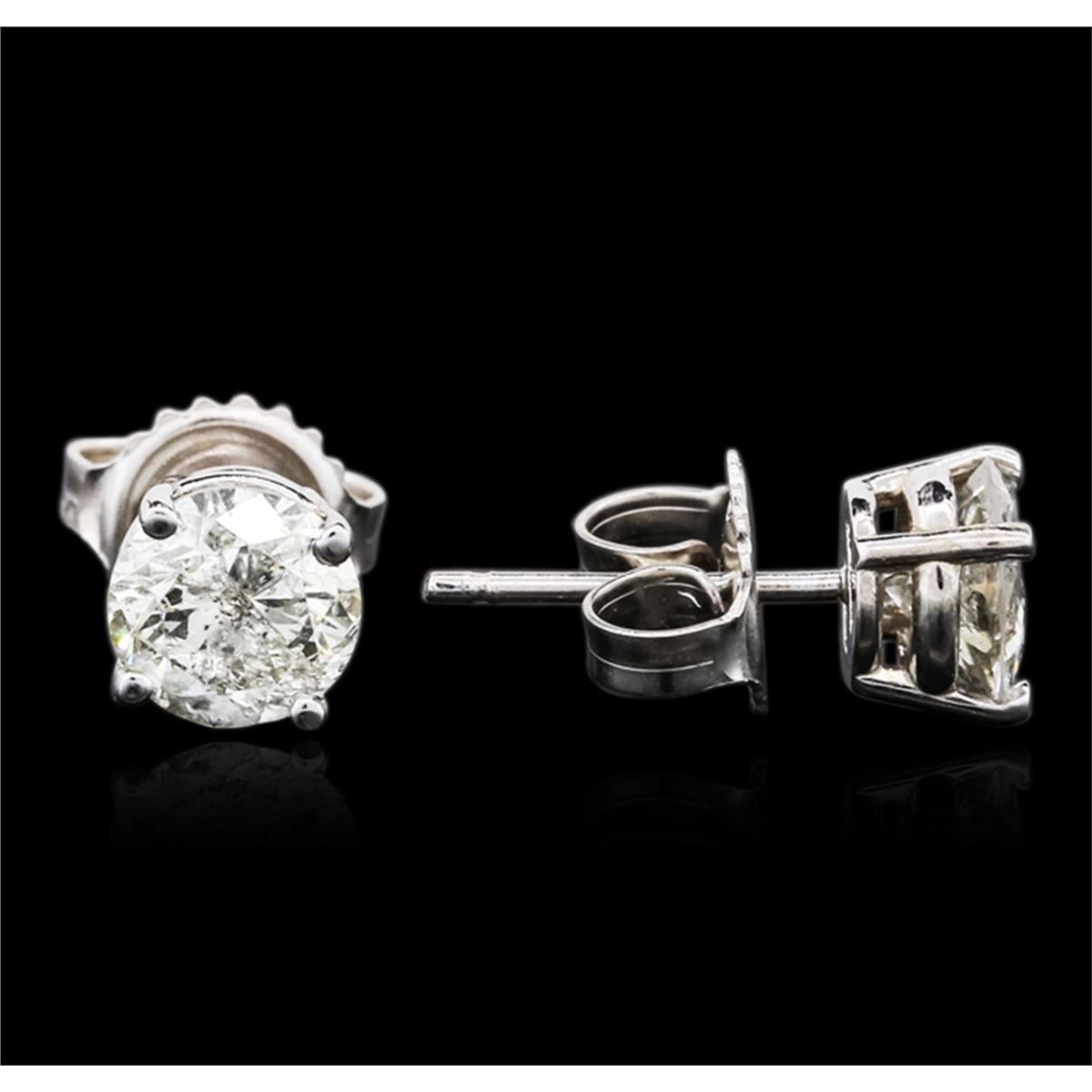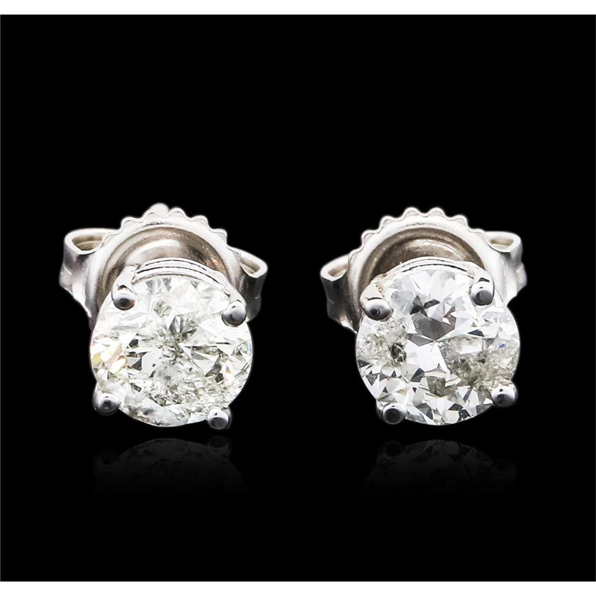 One pair electronically tested 14KT white gold cast & assembled diamond solitaire earrings with standard backs. Bright polish finish. Identified with markings of "14K". Condition is new, good workmanship. Containing: One prong set round brilliant cut diamond, measuring 6.10 - 6.05 x 3.80mm (depth est.), 4.00.%. GTCF approximate weight of 0.99ct with a medium strong blue fluorescence. Graded in the setting. Clarity: I-2. Color: 62.6%. Table 61.0%. One prong set round brilliant cut diamond, measuring 6.01 - 6.00 x 3.30mm (depth est.) approximate weight of 0.83ct. Graded in the setting. Clarity: I-2. Color: 54.9%. Table 61.6%. Total Weight of Diamonds 1.82ct. Total Weight of Earrings 1.48 grams. AIG Appraised at $8,610.00.