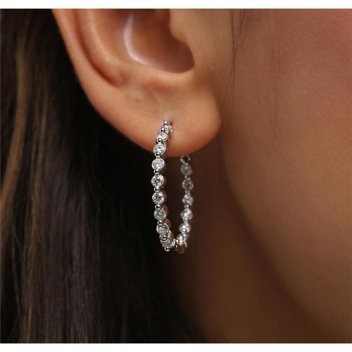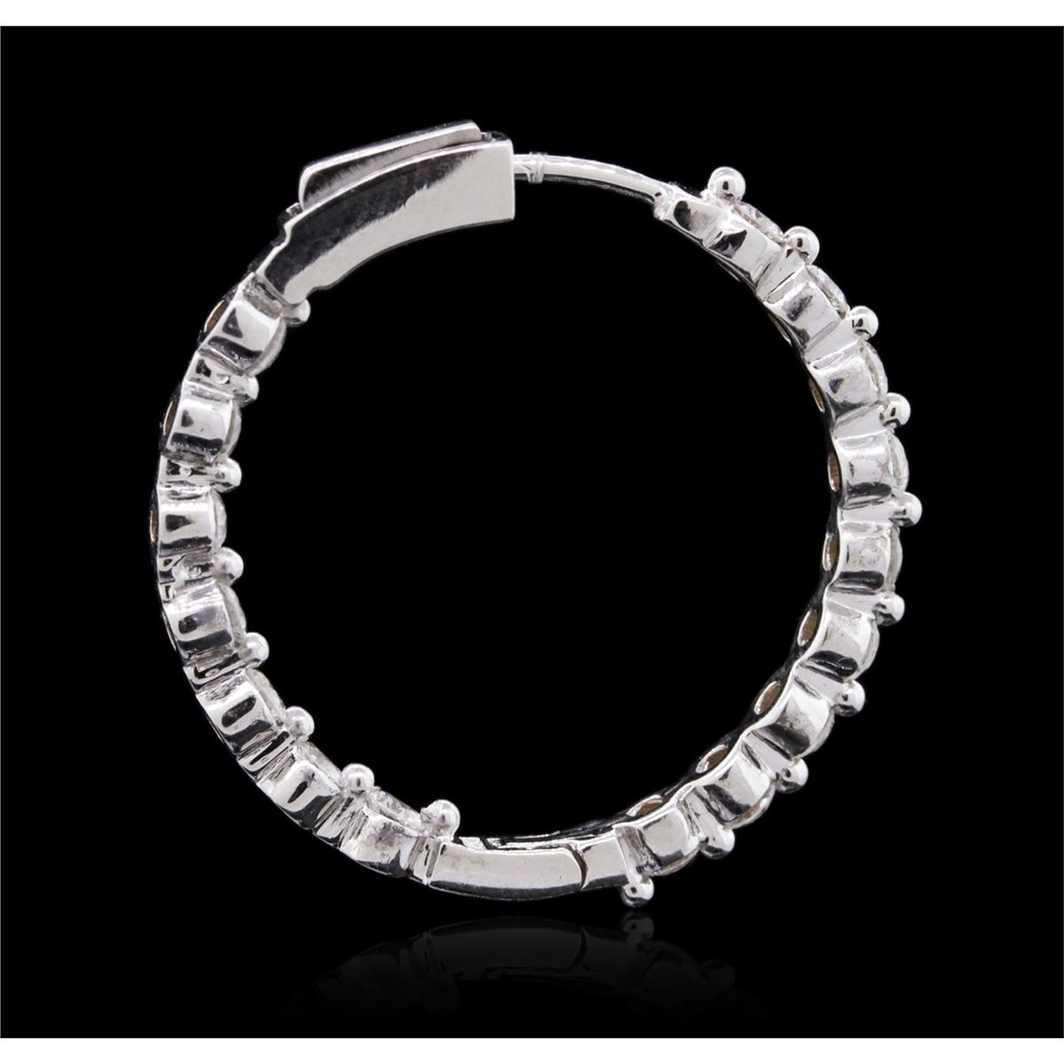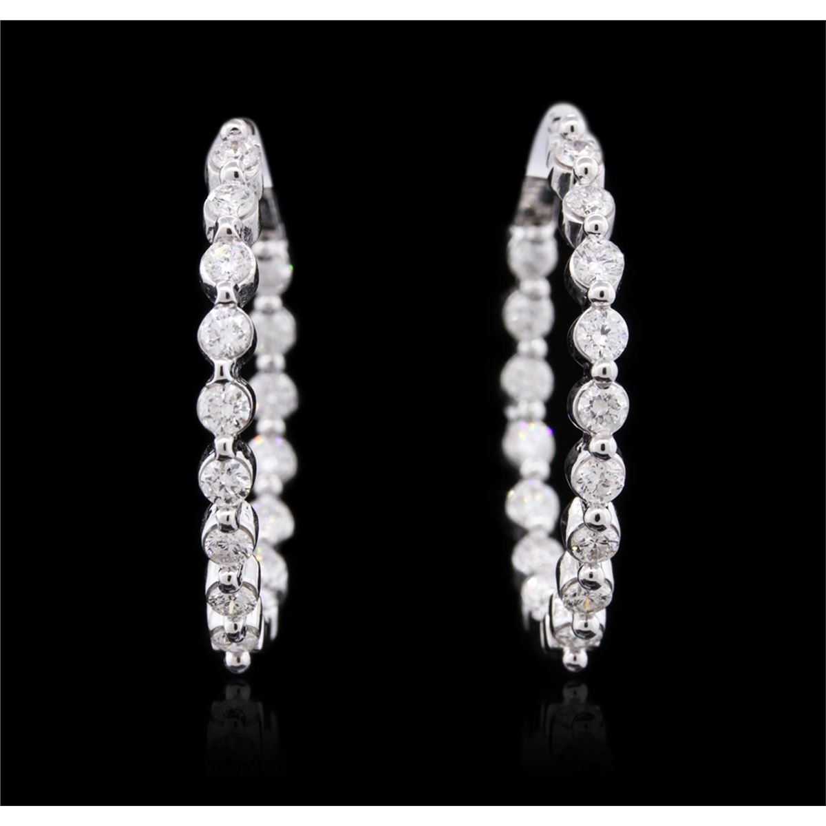 One pair electronically tested 14KT white gold ladies combination cast & assembled hoop earrings with hinged clip backs with a bright polish finish. Identified with markings of "14K". Condition is new. Containing: Thirty-Two prong set round brilliant cut diamonds, measuring 2.50 - 2.50 x 1.50mm (depth est.) approximate total weight of 32 Stones = 1.83ct. Clarity: SI-2 to I-1. Color: I - J, Cut is Good. All diamonds are graded in the mounting, unless otherwise stated. Total Weight of Diamonds 1.83ct. Total Weight of Earrings 8.60 grams. GGL Appraised at $5,375.00.