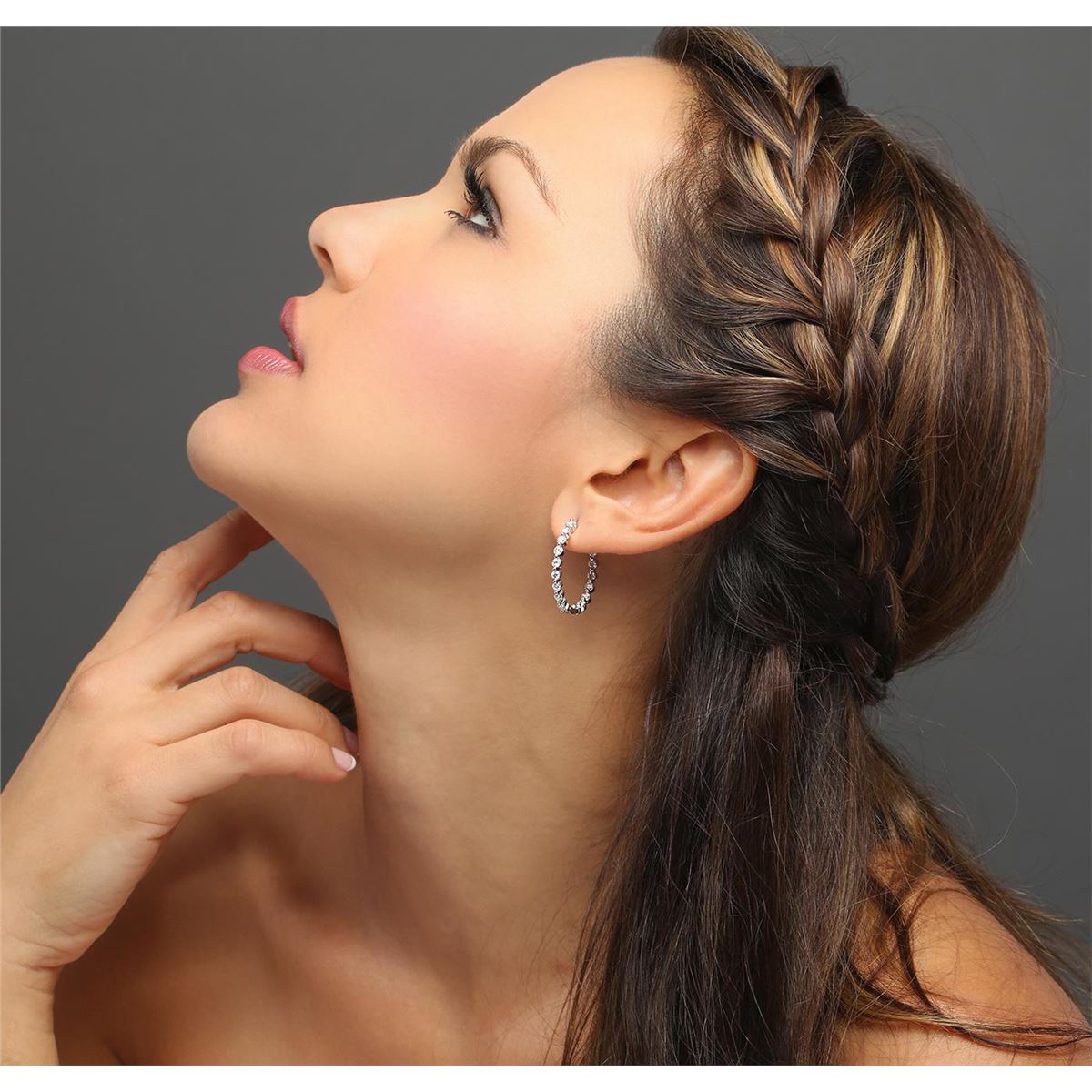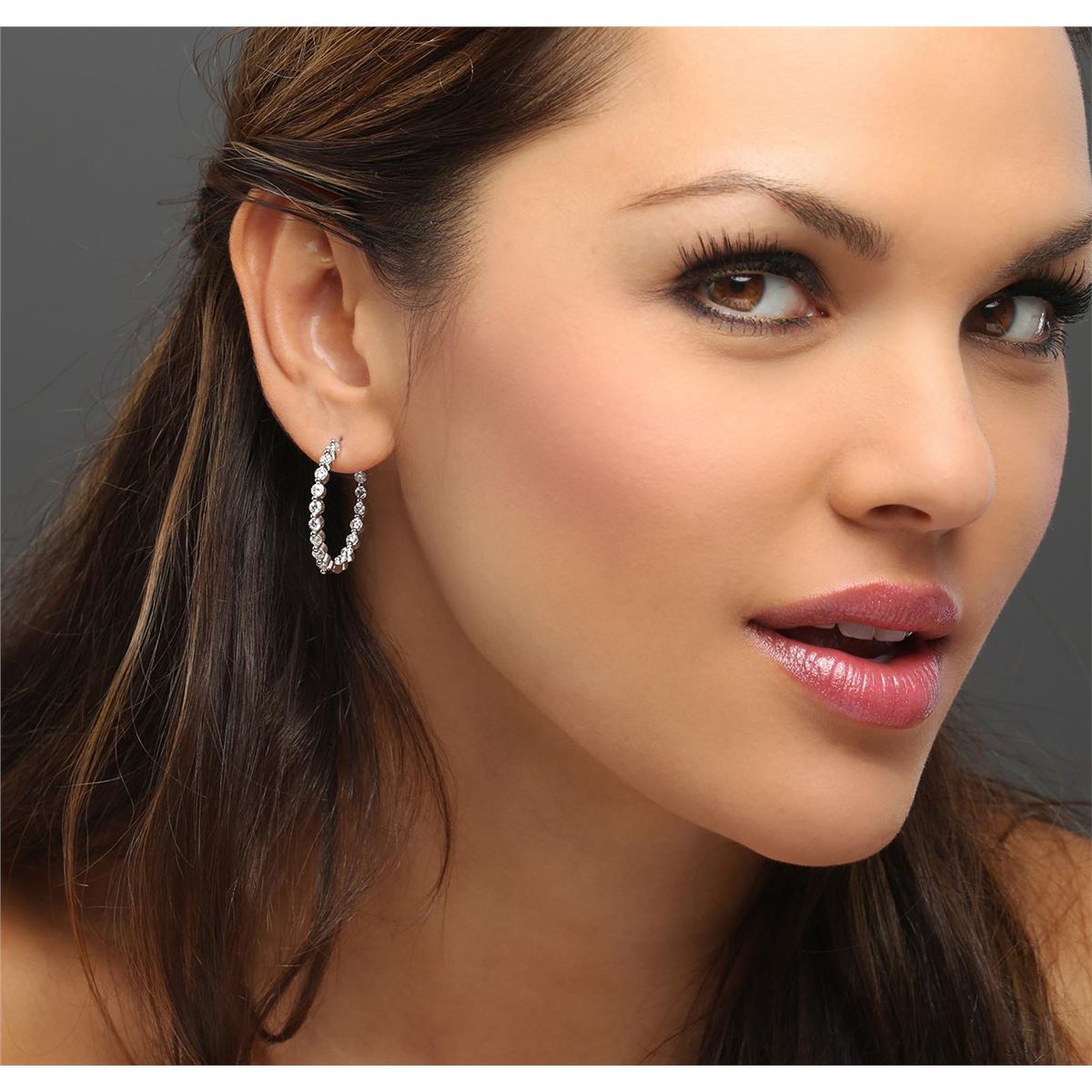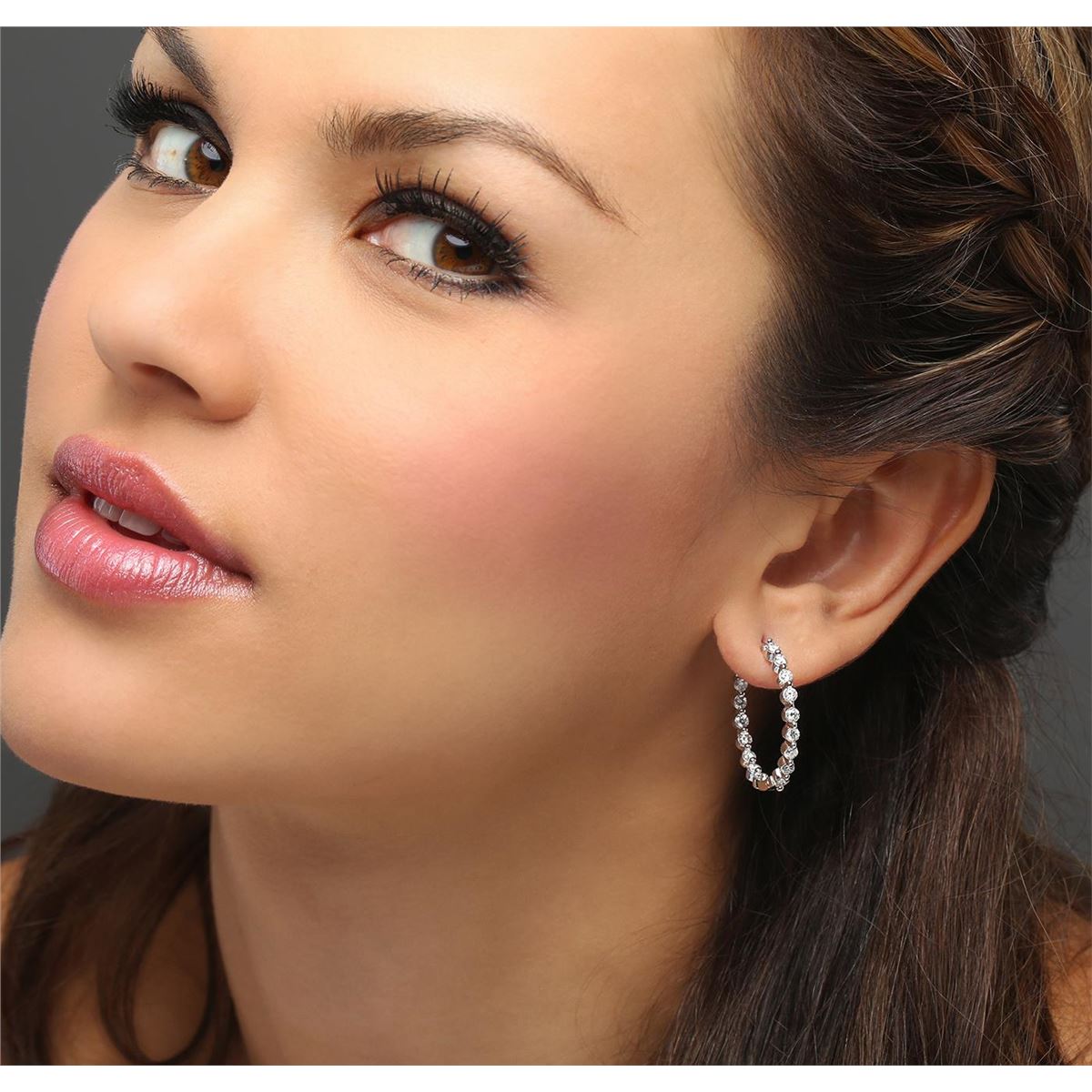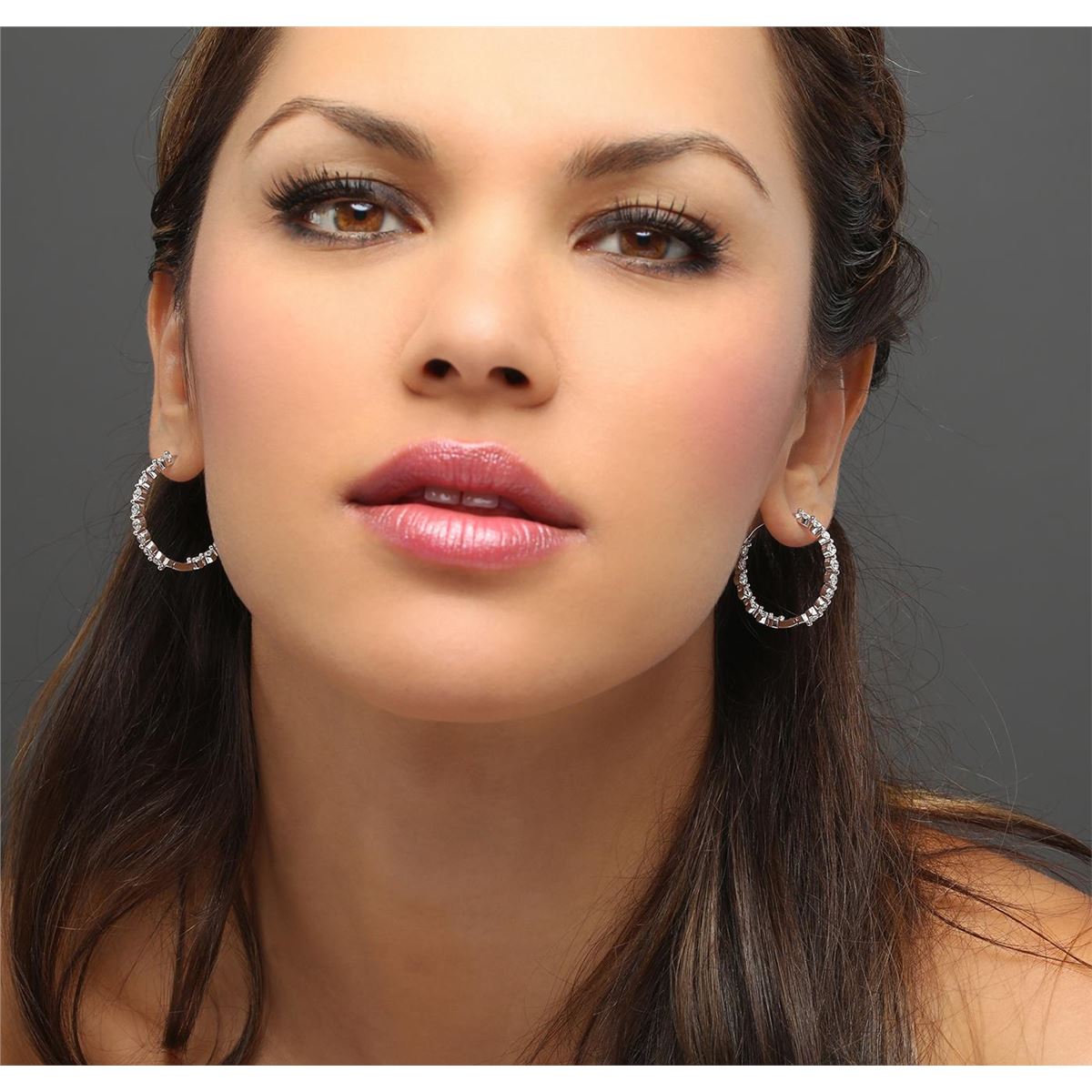 One pair electronically tested 14KT white gold ladies combination cast & assembled hoop earrings with hinged clip backs with a bright polish finish. Identified with markings of "14K". Condition is new. Containing: Thirty-Two prong set round brilliant cut diamonds, measuring 2.50 - 2.50 x 1.50mm (depth est.) approximate total weight of 32 Stones = 1.83ct. Clarity: SI-2 to I-1. Color: I - J, Cut is Good. All diamonds are graded in the mounting, unless otherwise stated. Total Weight of Diamonds 1.83ct. Total Weight of Earrings 8.60 grams. GGL Appraised at $5,375.00.