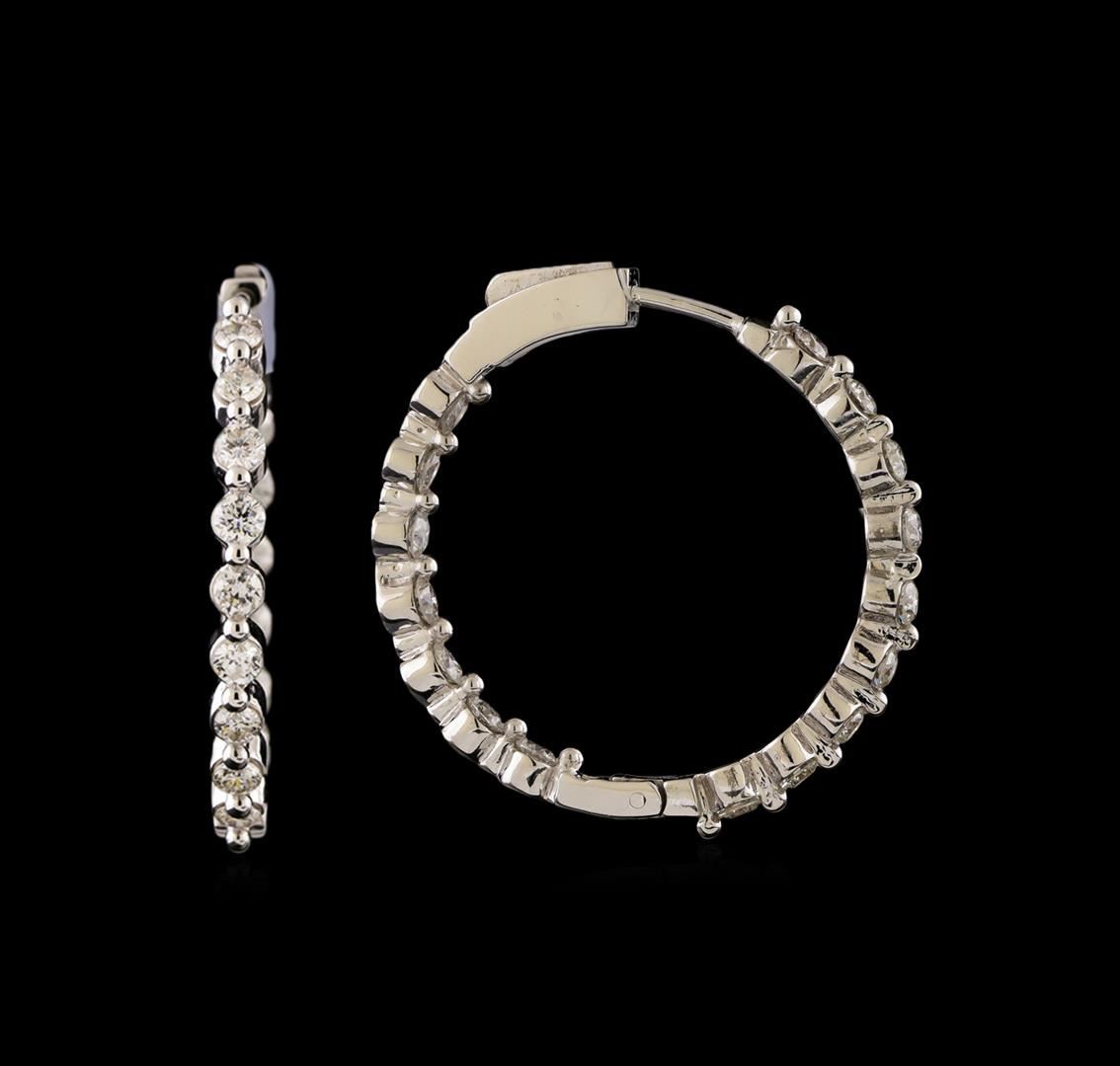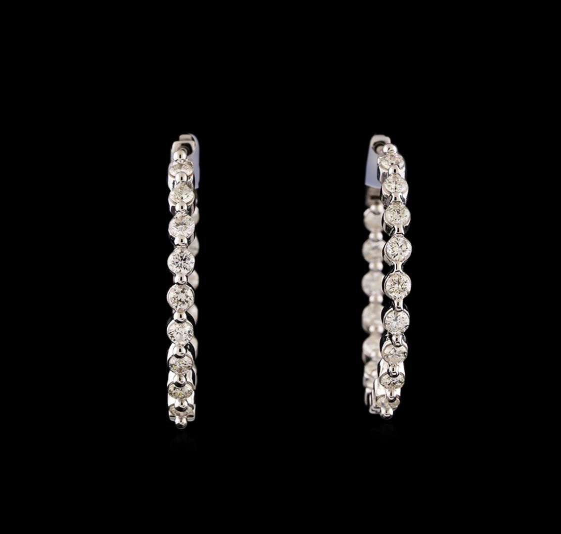 One pair electronically tested 14KT white gold ladies combination cast & assembled hoop earrings with hinged clip backs with a bright polish finish. Identified with markings of "14K". Condition is new. Containing: Thirty-Two prong set round brilliant cut diamonds, measuring 2.50 - 2.50 x 1.50mm (depth est.) approximate total weight of 32 Stones = 1.83ct. Clarity: SI-2 to I-1. Color: I - J, Cut is Good. All diamonds are graded in the mounting, unless otherwise stated. Total Weight of Diamonds 1.83ct. Total Weight of Earrings 8.60 grams. GGL Appraised at $5,375.00.