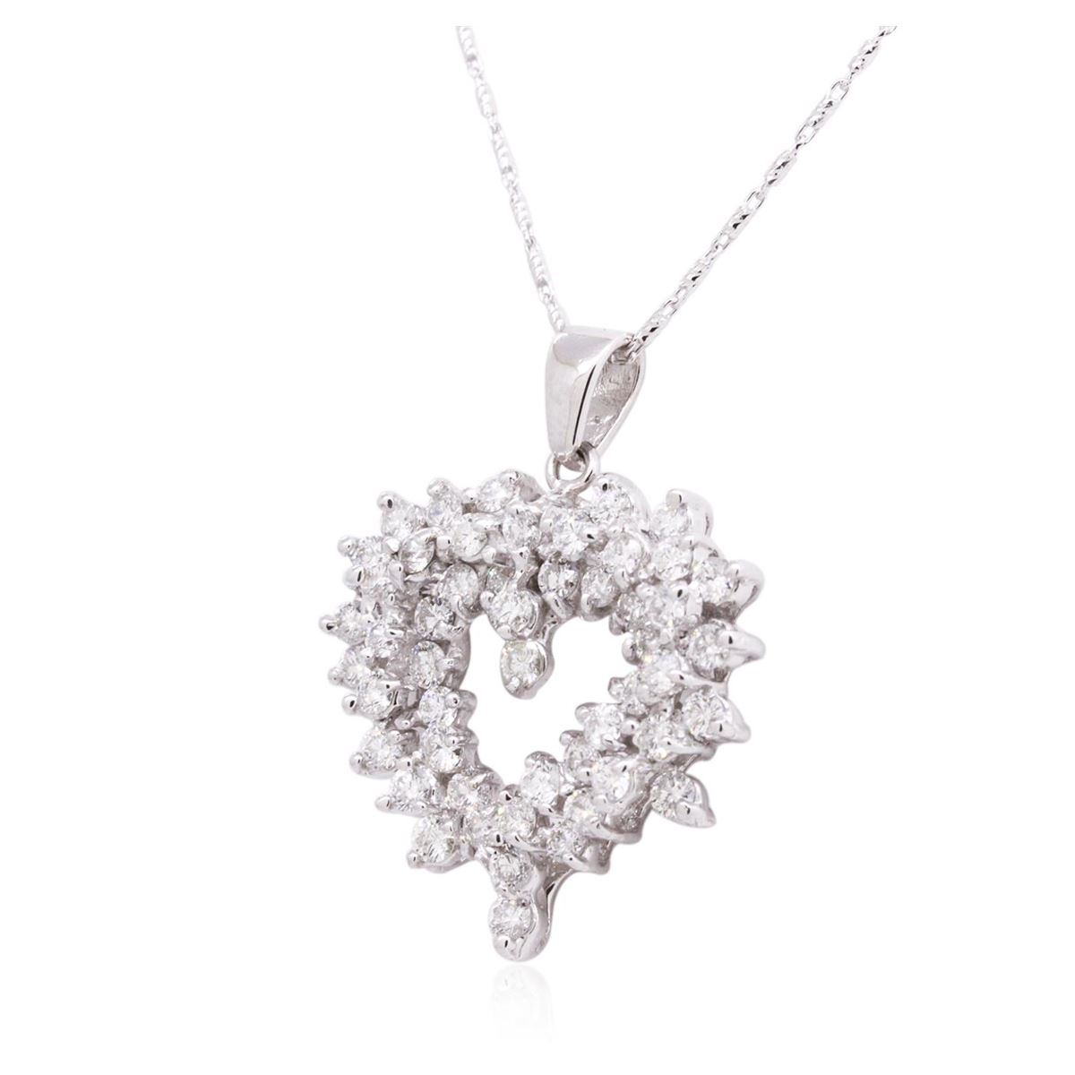 One electronically tested 14KT white gold ladies combination cast & assembled diamond pendant & chain 18.0" long, fancy link with a lobster claw clasp with a bright polish finish. Identified with markings of "14K". Condition is new. Containing: Forty-Four prong set round brilliant cut diamonds, measuring 2.50 - 2.00 x 1.35mm (depth est.) approximate total weight of 44 Stones = 1.83ct. Clarity: SI-2 to I-1. Color: J - K, Cut is Good. All diamonds are graded in the mounting, unless otherwise stated. Total Weight of Diamonds 1.83ct. Total Weight of Pendant & Chain 12.80 grams. GGL Appraised at $7,875.00.