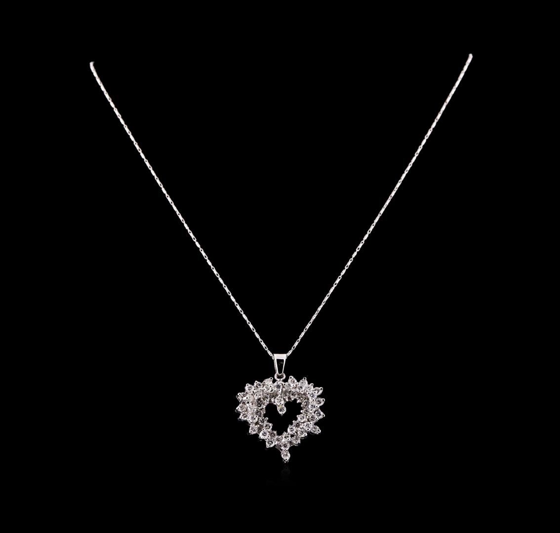 One electronically tested 14KT white gold ladies combination cast & assembled diamond pendant & chain 18.0" long, fancy link with a lobster claw clasp with a bright polish finish. Identified with markings of "14K". Condition is new. Containing: Forty-Four prong set round brilliant cut diamonds, measuring 2.50 - 2.00 x 1.35mm (depth est.) approximate total weight of 44 Stones = 1.83ct. Clarity: SI-2 to I-1. Color: J - K, Cut is Good. All diamonds are graded in the mounting, unless otherwise stated. Total Weight of Diamonds 1.83ct. Total Weight of Pendant & Chain 12.80 grams. GGL Appraised at $7,875.00.
