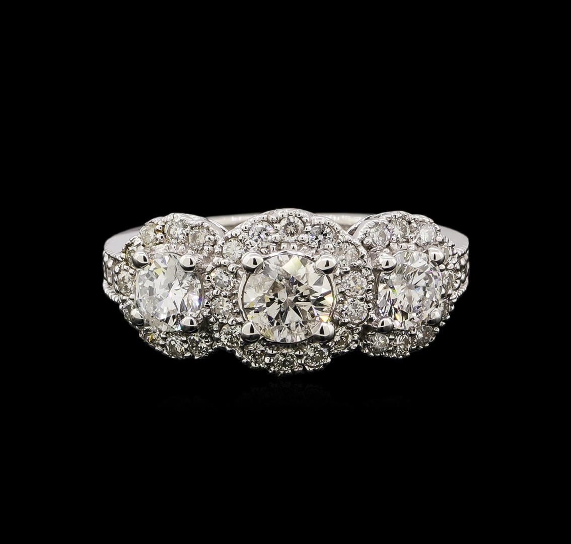 One electronically tested 14KT white gold ladies combination cast & assembled diamond engagement ring with a bright polish finish. Identified with markings of "14K". Condition is new. Containing: One prong set round brilliant cut diamond, measuring 5.50 - 5.50 x 3.30mm (depth est.) approximate weight of 0.61ct. Clarity: I-2. Color: I, Cut is Good. Two prong set round brilliant cut diamonds, measuring 5.00 - 5.00 x 3.00mm (depth est.) approximate total weight of 2 Stones = 0.92ct. Clarity: I-1. Color: H, Cut is Good. Thirty-Eight prong set round brilliant cut diamonds, measuring 1.30 - 1.30 x 0.78mm (depth est.) approximate total weight of 38 Stones = 0.30ct. Clarity: SI-2 to I-1. Color: H - I, Cut is Good. All diamonds are graded in the mounting, unless otherwise stated. Total Weight of Diamonds 1.83ct. Total Weight of Engagement Ring 6.20 grams. GGL Appraised at $7,505.00.