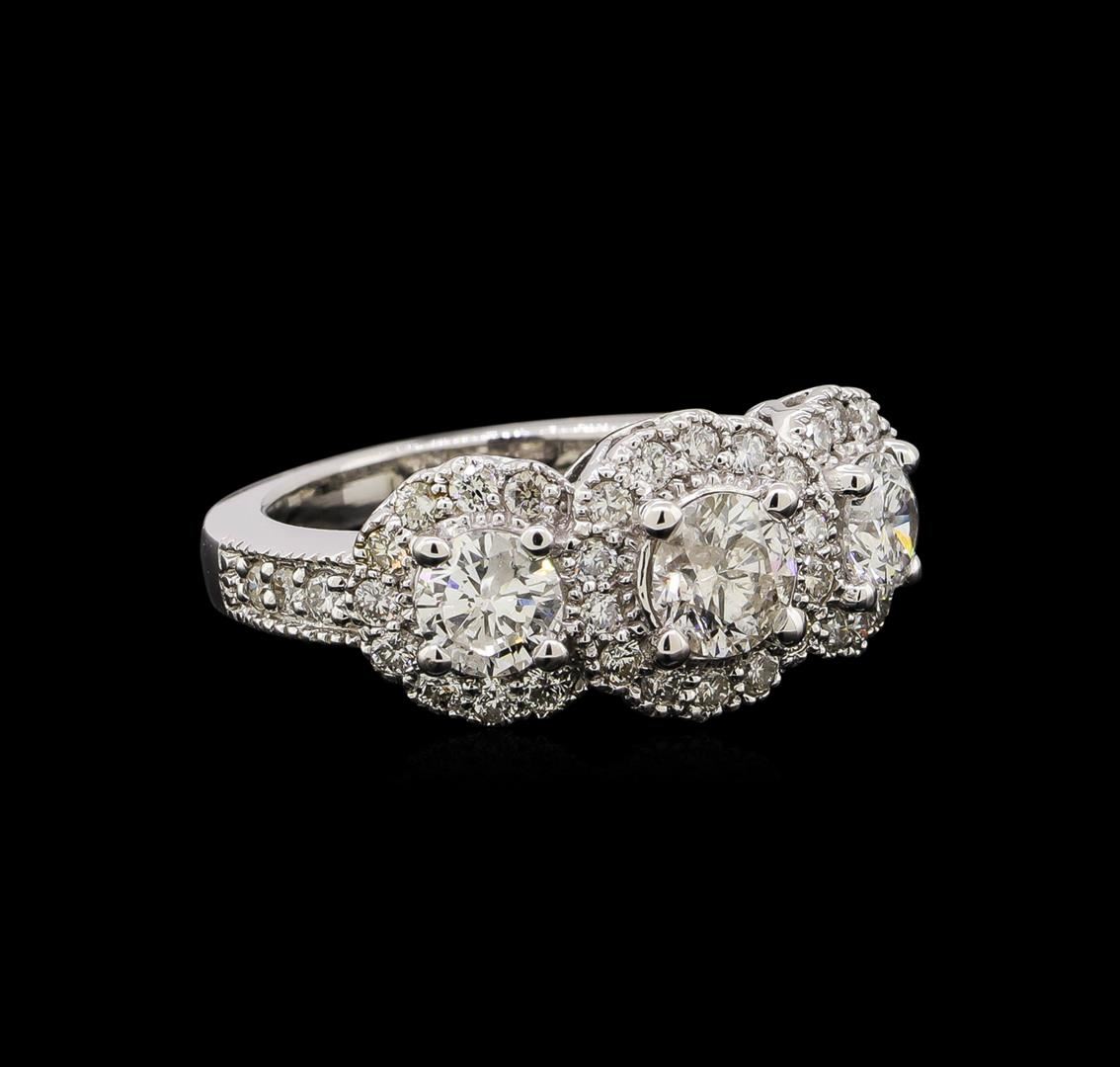 One electronically tested 14KT white gold ladies combination cast & assembled diamond engagement ring with a bright polish finish. Identified with markings of "14K". Condition is new. Containing: One prong set round brilliant cut diamond, measuring 5.50 - 5.50 x 3.30mm (depth est.) approximate weight of 0.61ct. Clarity: I-2. Color: I, Cut is Good. Two prong set round brilliant cut diamonds, measuring 5.00 - 5.00 x 3.00mm (depth est.) approximate total weight of 2 Stones = 0.92ct. Clarity: I-1. Color: H, Cut is Good. Thirty-Eight prong set round brilliant cut diamonds, measuring 1.30 - 1.30 x 0.78mm (depth est.) approximate total weight of 38 Stones = 0.30ct. Clarity: SI-2 to I-1. Color: H - I, Cut is Good. All diamonds are graded in the mounting, unless otherwise stated. Total Weight of Diamonds 1.83ct. Total Weight of Engagement Ring 6.20 grams. GGL Appraised at $7,505.00.