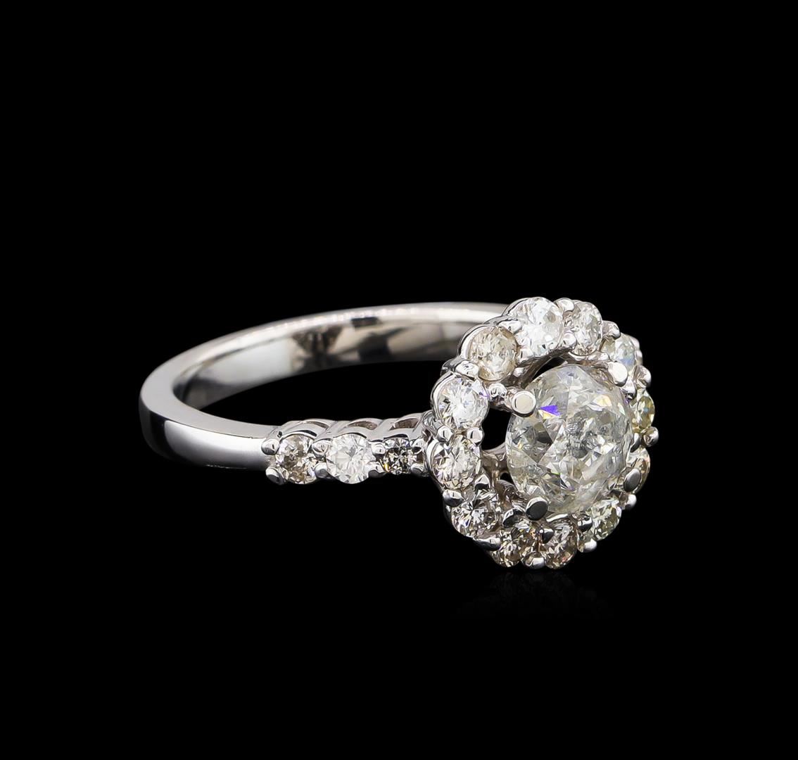 One electronically tested 14KT white gold ladies cast diamond unity ring with a bright polish finish. Condition is new, good workmanship. The featured diamond is set within a diamond bezel supported by diamond set shoulders, completed by a two and one-half millimeter wide band. Identified with markings of "585". Containing: One prong set round brilliant cut diamond, measuring 6.15 - 6.10 x 4.10mm (depth est.), 5.00.%. GTCF approximate weight of 1.10ct. Graded in the setting. Clarity: I-2. Color: JDepth 66.9%. Table 57.1%. Eighteen prong set round brilliant cut diamonds, measuring 2.50 - 1.80 x 1.29mm (depth est.) approximate. Total Weight of 18 Stones = 0.73ct. Graded in the setting. Clarity: I-1 to I-2. Color: I - K. Total Weight of Diamonds 1.83ct. Total Weight of Ring 3.96 grams. AIG Appraised at $10,635.00.