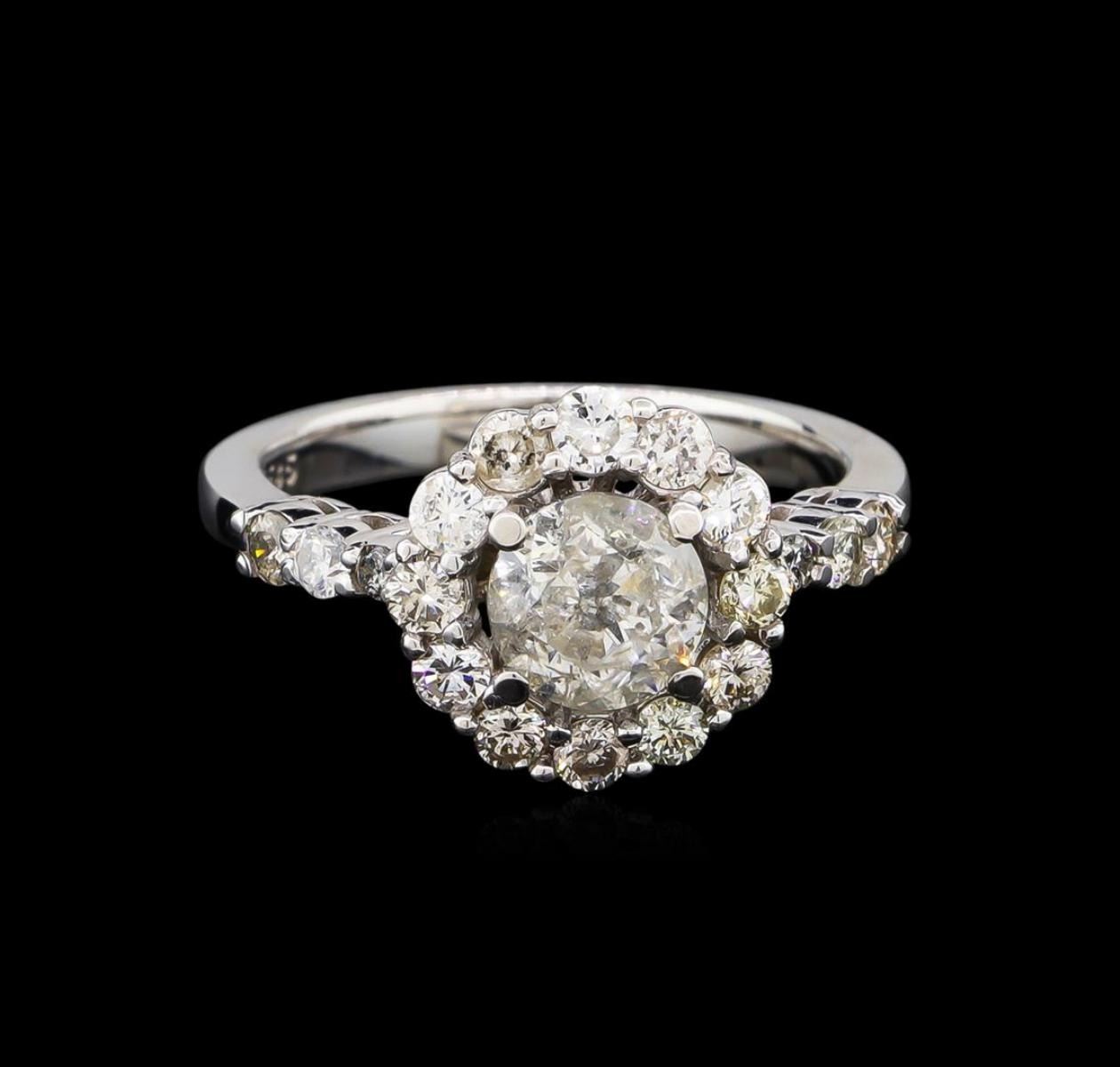 One electronically tested 14KT white gold ladies cast diamond unity ring with a bright polish finish. Condition is new, good workmanship. The featured diamond is set within a diamond bezel supported by diamond set shoulders, completed by a two and one-half millimeter wide band. Identified with markings of "585". Containing: One prong set round brilliant cut diamond, measuring 6.15 - 6.10 x 4.10mm (depth est.), 5.00.%. GTCF approximate weight of 1.10ct. Graded in the setting. Clarity: I-2. Color: JDepth 66.9%. Table 57.1%. Eighteen prong set round brilliant cut diamonds, measuring 2.50 - 1.80 x 1.29mm (depth est.) approximate. Total Weight of 18 Stones = 0.73ct. Graded in the setting. Clarity: I-1 to I-2. Color: I - K. Total Weight of Diamonds 1.83ct. Total Weight of Ring 3.96 grams. AIG Appraised.