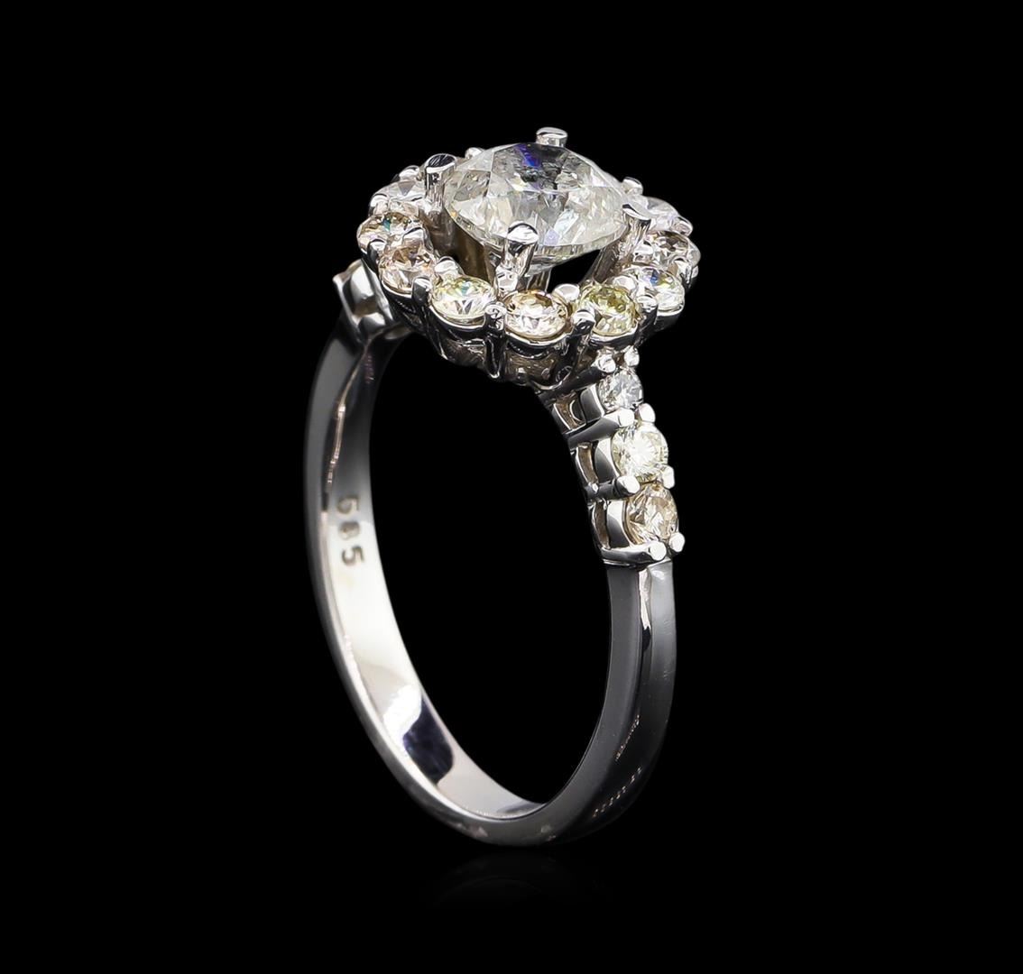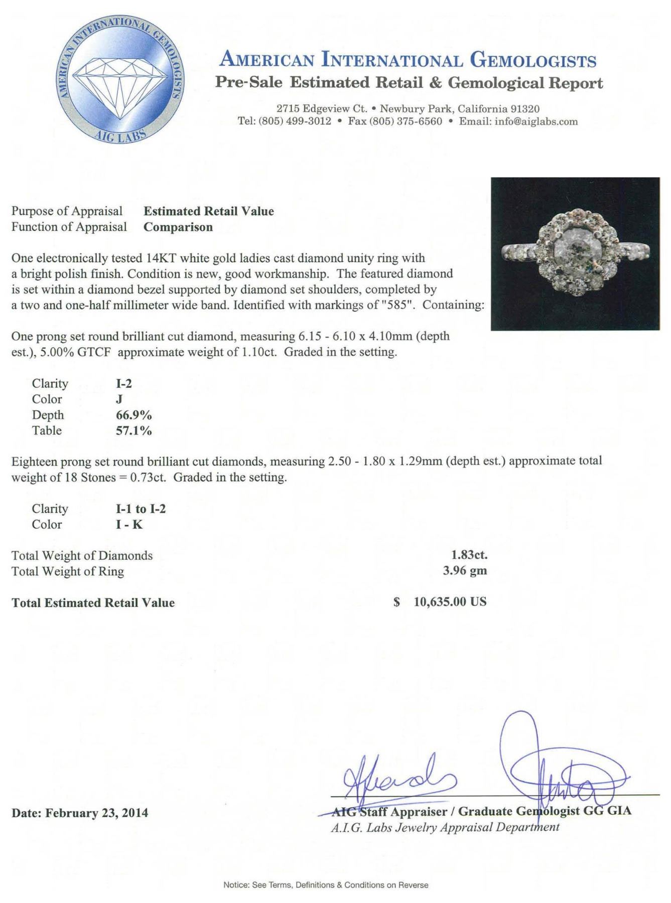 One electronically tested 14KT white gold ladies cast diamond unity ring with a bright polish finish. Condition is new, good workmanship. The featured diamond is set within a diamond bezel supported by diamond set shoulders, completed by a two and one-half millimeter wide band. Identified with markings of "585". Containing: One prong set round brilliant cut diamond, measuring 6.15 - 6.10 x 4.10mm (depth est.), 5.00.%. GTCF approximate weight of 1.10 ct. Graded in the setting. Clarity: I-2. Color: JDepth 66.9%. Table 57.1%. Eighteen prong set round brilliant cut diamonds, measuring 2.50 - 1.80 x 1.29mm (depth est.) approximate. Total Weight of 18 Stones = 0.73ct. Graded in the setting. Clarity: I-1 to I-2. Color: I - K. Total Weight of Diamonds 1.83ct. Total Weight of Ring 3.96 grams. AIG Appraised.