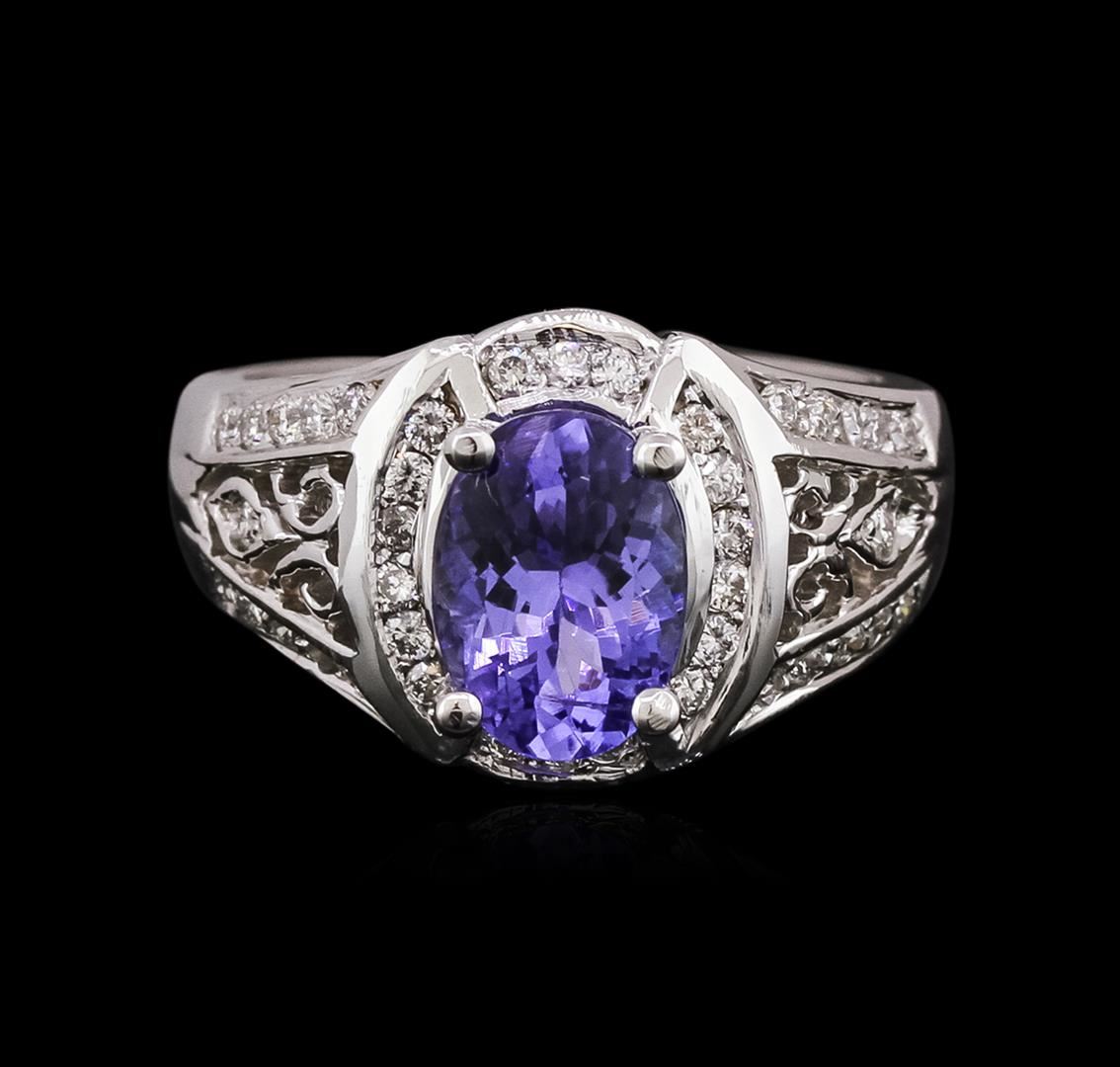 One electronically tested 14KT white gold ladies cast tanzanite and diamond ring with a bright polish finish. Identified with markings of "14KT". Condition is new. Containing: One prong set oval modified brilliant cut natural tanzanite, measuring 9.20 x 6.60 x 4.29mm, approximate weight of 1.83ct., clarity is eye clean, type I, medium light, very slightly grayish, violet color, (GIA V 4/3), cut is very good. Forty-One prong set round brilliant cut diamonds, measuring 1.30 - 1.30 x 0.78mm (depth est.) approximate total weight of 41 Stones = 0.33ct. Clarity: SI-1 to SI-2. Color: I - J, Cut is Good. Colored gemstones are presumed to have been subjected to commonly used enhancement processes. All diamonds and colored gemstones are graded in the mounting, unless otherwise stated. Total Weight of Colored Stones 1.83ct. Total Weight of Diamonds 0.33ct. Total Weight of Ring 7.00 grams. GGL Appraised at $4,090.00.