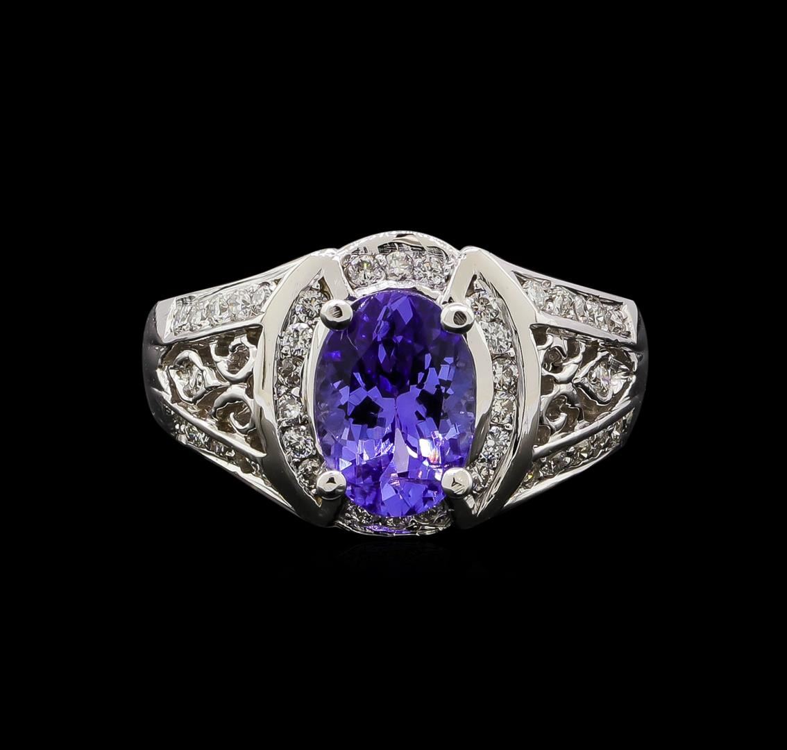 One electronically tested 14KT white gold ladies cast tanzanite and diamond ring with a bright polish finish. Identified with markings of "14KT". Condition is new. Containing: One prong set oval modified brilliant cut natural tanzanite, measuring 9.20 x 6.60 x 4.29mm, approximate weight of 1.83ct., clarity is eye clean, type I, medium light, very slightly grayish, violet color, (GIA V 4/3), cut is very good. Forty-One prong set round brilliant cut diamonds, measuring 1.30 - 1.30 x 0.78mm (depth est.) approximate total weight of 41 Stones = 0.33ct. Clarity: SI-1 to SI-2. Color: I - J, Cut is Good. Colored gemstones are presumed to have been subjected to commonly used enhancement processes. All diamonds and colored gemstones are graded in the mounting, unless otherwise stated. Total Weight of Colored Stones 1.83ct. Total Weight of Diamonds 0.33ct. Total Weight of Ring 7.00 grams. GGL Appraised at $4,090.00.