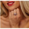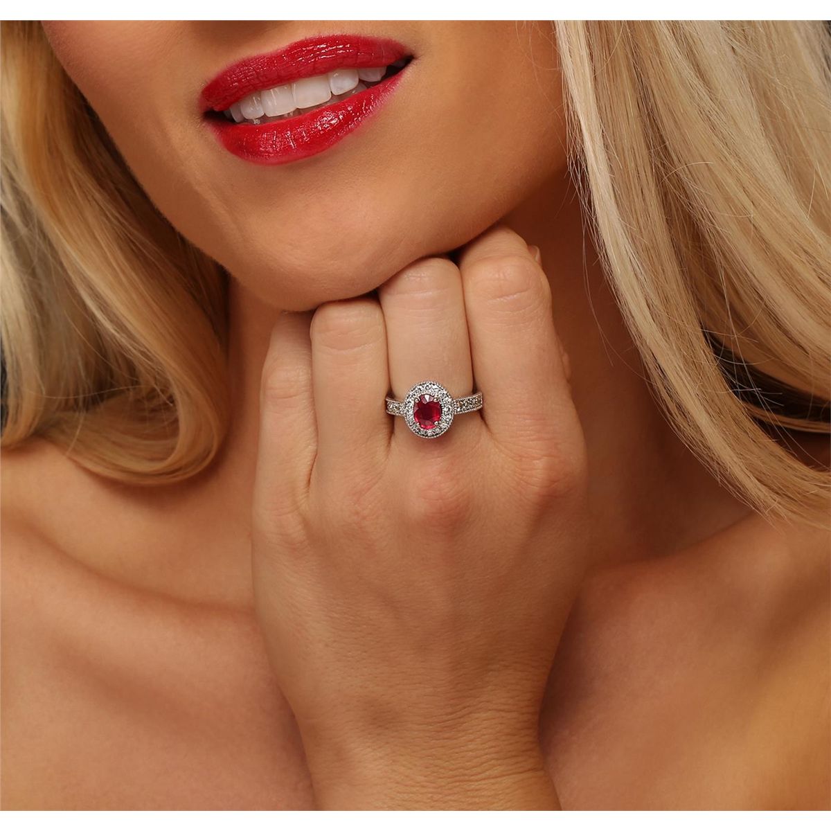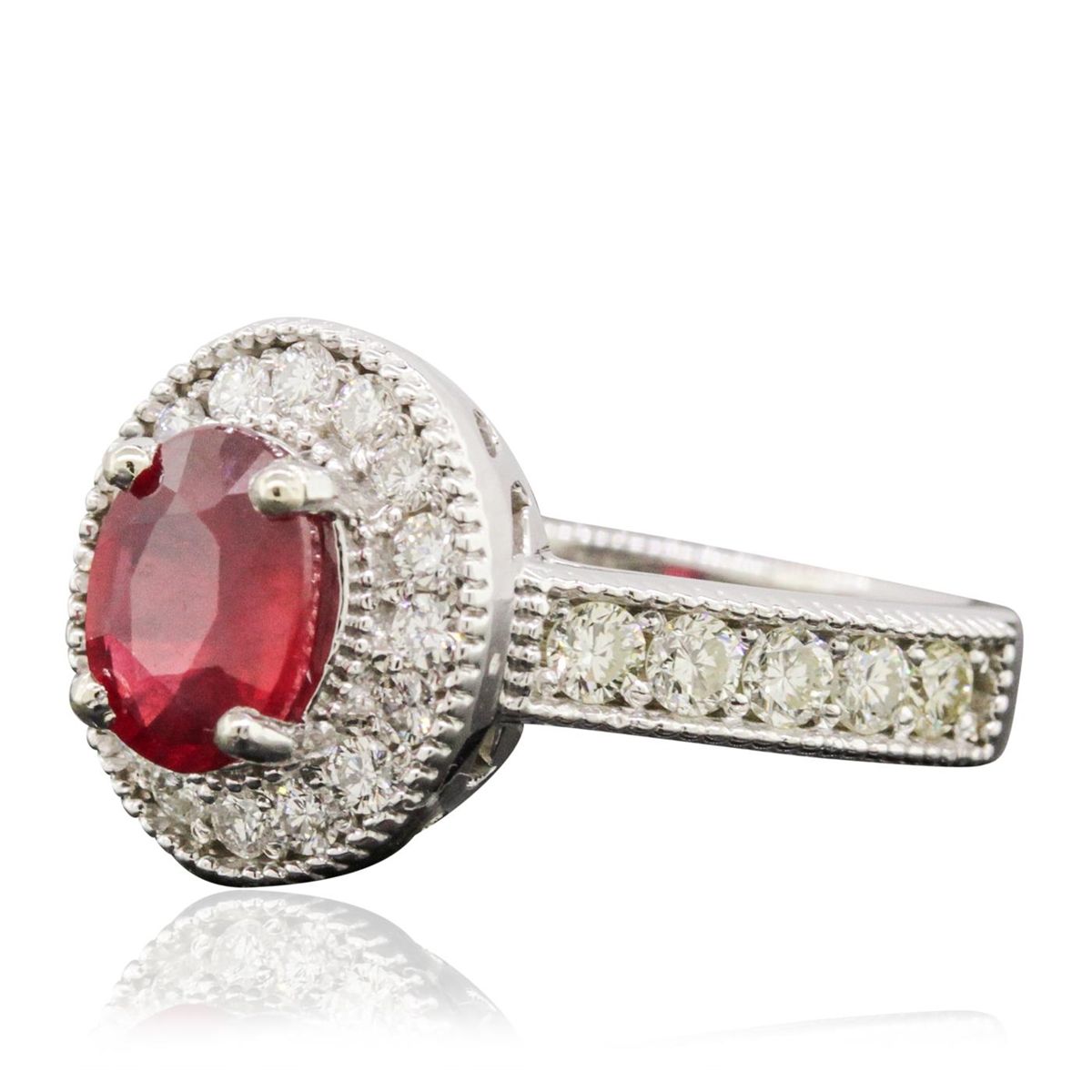 One electronically tested 14KT white gold ladies combination cast & assembled ring with a bright polish finish. Condition is new. Identified with markings of "14K". Containing: One prong set oval modified brilliant cut natural ruby, measuring 7.70 x 6.00 x 4.88mm, approximate weight of 1.83ct., clarity is heavily included, type II, medium, moderately strong, strongly purplish red color, (GIA stpR 5/4), cut is good. Sixteen prong set round brilliant cut diamonds, measuring 1.70 - 1.70 x 1.02mm (depth est.) approximate total weight of 16 Stones = 0.29ct. Clarity: SI-1 to SI-2. Color: I - J, Cut is Good. Ten prong set round brilliant cut diamonds, measuring 2.50 - 2.50 x 1.50mm (depth est.) approximate total weight of 10 Stones = 0.57ct. Clarity: SI-1 to SI-2. Color: J - K, Cut is Good. Colored gemstones are presumed to have been subjected to commonly used enhancement processes. All diamonds and colored gemstones are graded in the mounting, unless otherwise stated. Total Weight of Colored Stones 1.83ct. Total Weight of Diamonds 0.86ct. Total Weight of Ring 6.30 grams. GGL Appraised at $4,765.00.