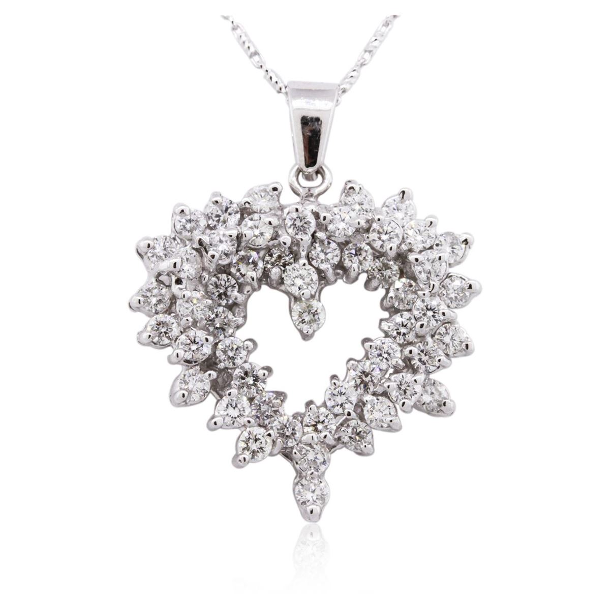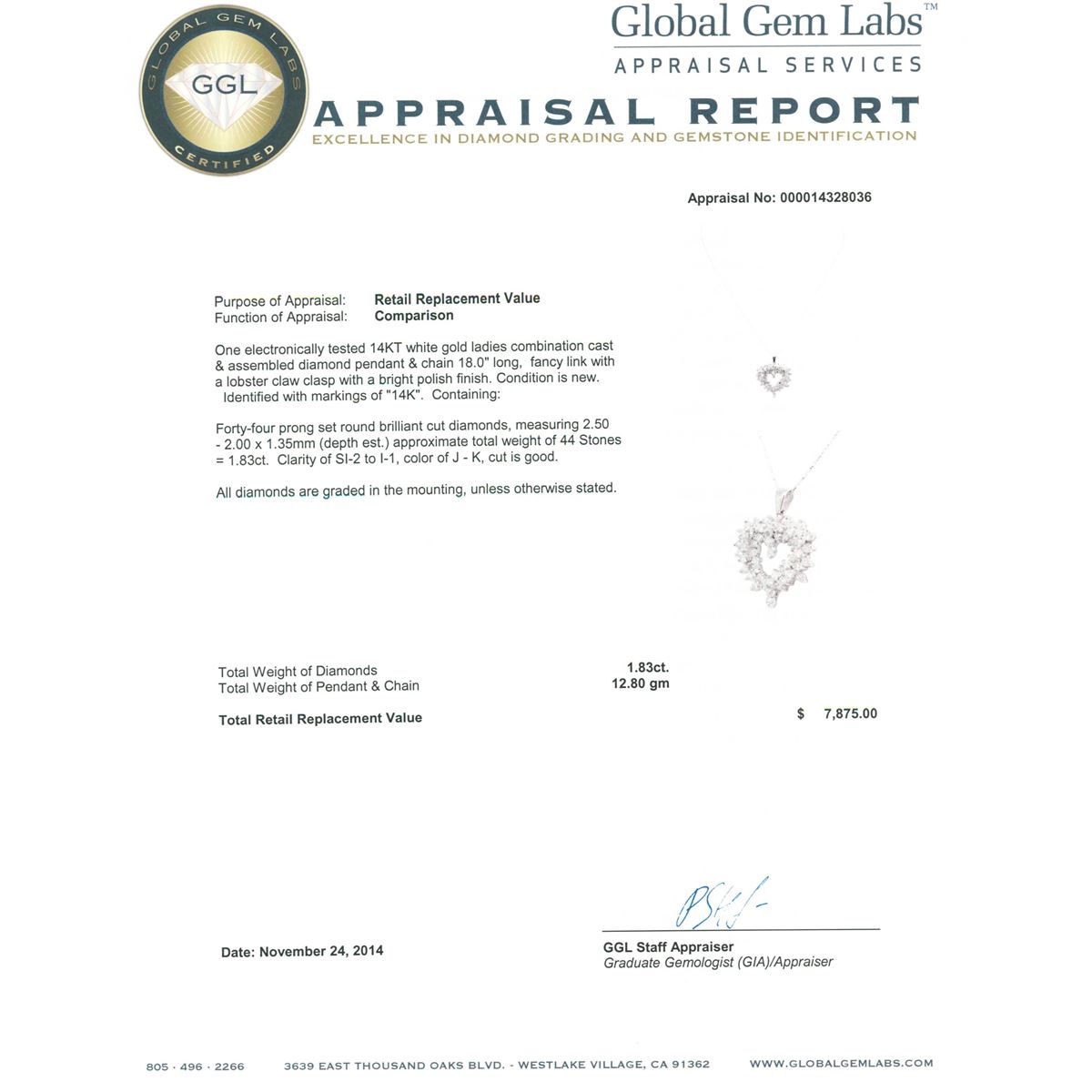 One electronically tested 14KT white gold ladies combination cast & assembled diamond pendant & chain 18.0" long, fancy link with a lobster claw clasp with a bright polish finish. Identified with markings of "14K". Condition is new. Containing: Forty-Four prong set round brilliant cut diamonds, measuring 2.50 - 2.00 x 1.35mm (depth est.) approximate total weight of 44 Stones = 1.83ct. Clarity: SI-2 to I-1. Color: J - K, Cut is Good. All diamonds are graded in the mounting, unless otherwise stated. Total Weight of Diamonds 1.83ct. Total Weight of Pendant & Chain 12.80 grams. GGL Appraised at $7,875.00.