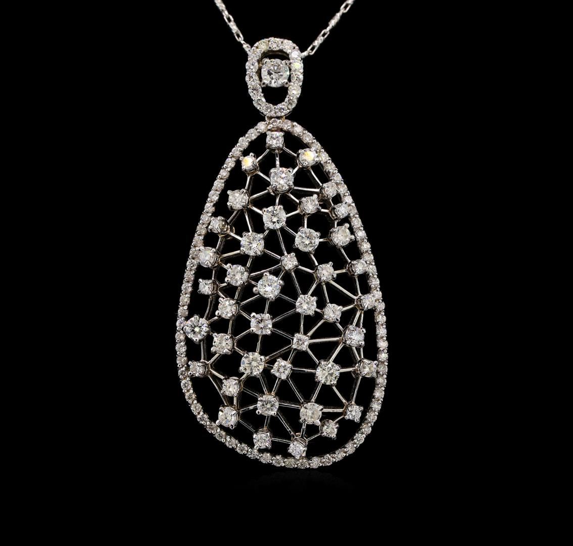 One electronically tested 14KT white gold ladies cast diamond pendant & chain 18.0" long, with a lobster claw clasp with a bright polish finish. Identified with markings of "14K". Condition is new. Containing: One prong set round brilliant cut diamond, measuring 3.00. - 3.00. x 1.80mm (depth est.) approximate weight of 0.10ct. Clarity: I-2. Color: I. Thirty-Five prong set round brilliant cut diamonds, measuring 2.50 - 1.50 x 1.20mm (depth est.) approximate total weight of 35 Stones = 1.02ct. Clarity: SI-1 to I-1. Color: I - J. One Hundred Fourteen prong set round brilliant cut diamonds, measuring 1.20 - 1.20 x 0.72mm (depth est.) approximate total weight of 114 Stones = 0.72ct. Clarity: I-1 to I-2. Color: I - J. All diamonds are graded in the mounting, unless otherwise stated. Total Weight of Diamonds 1.84ct. Total Weight of Pendant & Chain 10.40 grams. GGL Appraised at $6,265.00.
