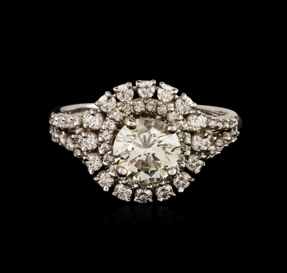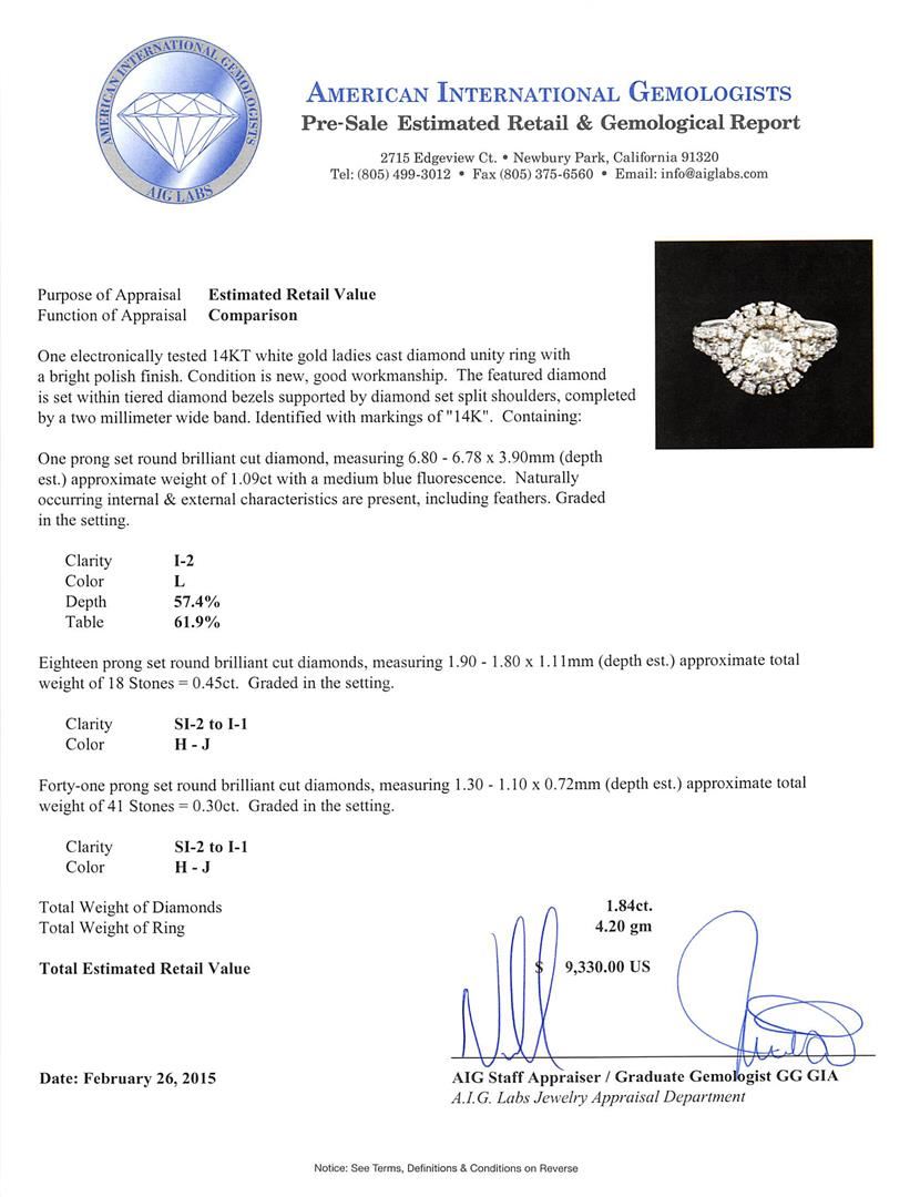 One electronically tested 14KT white gold ladies cast diamond unity ring with a bright polish finish. The featured diamond is set within tiered diamond bezels supported by diamond set split shoulders, completed by a two millimeter wide band. Identified with markings of "14K". Condition is new, good workmanship. Containing: One prong set round brilliant cut diamond, measuring 6.80 - 6.78 x 3.90mm (depth est.) approximate weight of 1.09ct with a medium blue fluorescence. Naturally occurring internal & external characteristics are present, including feathers. Graded in the setting. Clarity: I-2. Color: L. Depth 57.4%. Table 61.9%. Eighteen prong set round brilliant cut diamonds, measuring 1.90 - 1.80 x 1.11mm (depth est.) approximate total weight of 18 Stones = 0.45ct. Graded in the setting. Clarity: SI-2 to I-1. Color: H - J Forty-One prong set round brilliant cut diamonds, measuring 1.30 - 1.10 x 0.72mm (depth est.) approximate total weight of 41 Stones = 0.30ct. Graded in the setting. Clarity: SI-2 to I-1. Color: H - J. Total Weight of Diamonds 1.84ct. Total Weight of Ring 4.20 grams. AIG Appraised at $9,330.00.