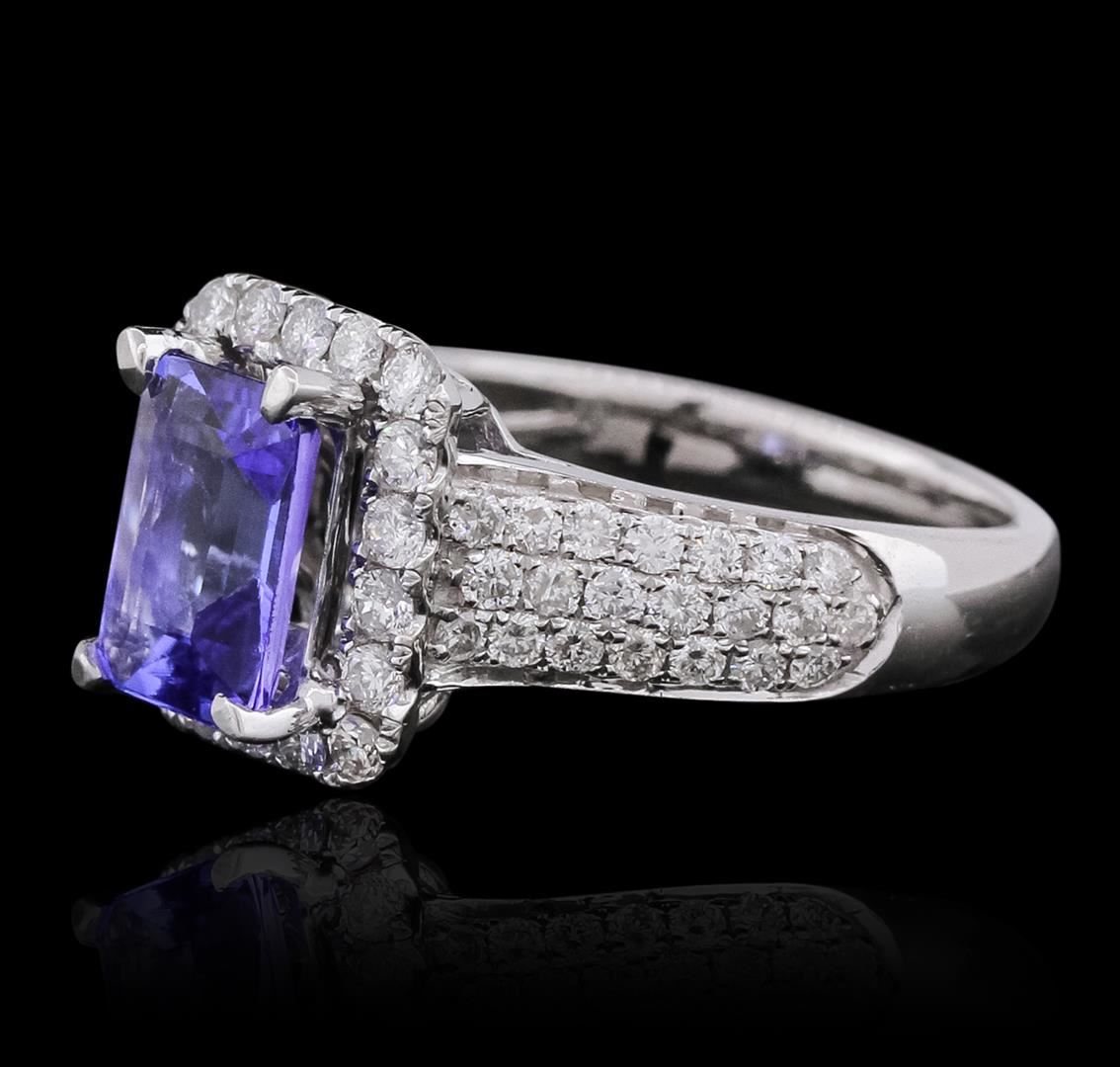 One electronically tested 14KT white gold ladies combination cast & assembled ring with a bright polish finish. Identified with markings of "14K". Condition is new. Containing: One prong set emerald standard step cut natural tanzanite, measuring 8.57 x 5.94 x 3.99mm, approximate weight of 1.84ct., clarity is eye clean, type I, medium, very slightly grayish, bluish violet color, (GIA bV 5/3), cut is good. Sixty prong set round brilliant cut diamonds, measuring 1.80 - 1.50 x 0.99mm (depth est.) approximate total weight of 60 Stones = 0.98ct. Clarity: SI-2 to I-1. Color: G - H, Cut is Good. Colored gemstones are presumed to have been subjected to commonly used enhancement processes. All diamonds and colored gemstones are graded in the mounting, unless otherwise stated. Total Weight of Colored Stones 1.84ct. Total Weight of Diamonds 0.98ct. Total Weight of Ring 5.50 grams. GGL Appraised at $7,215.00.
