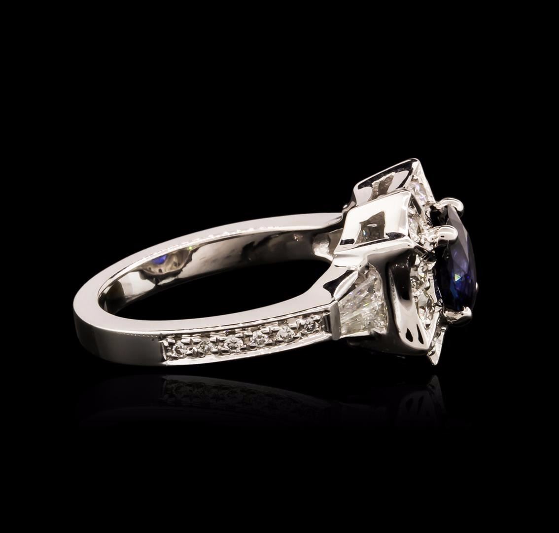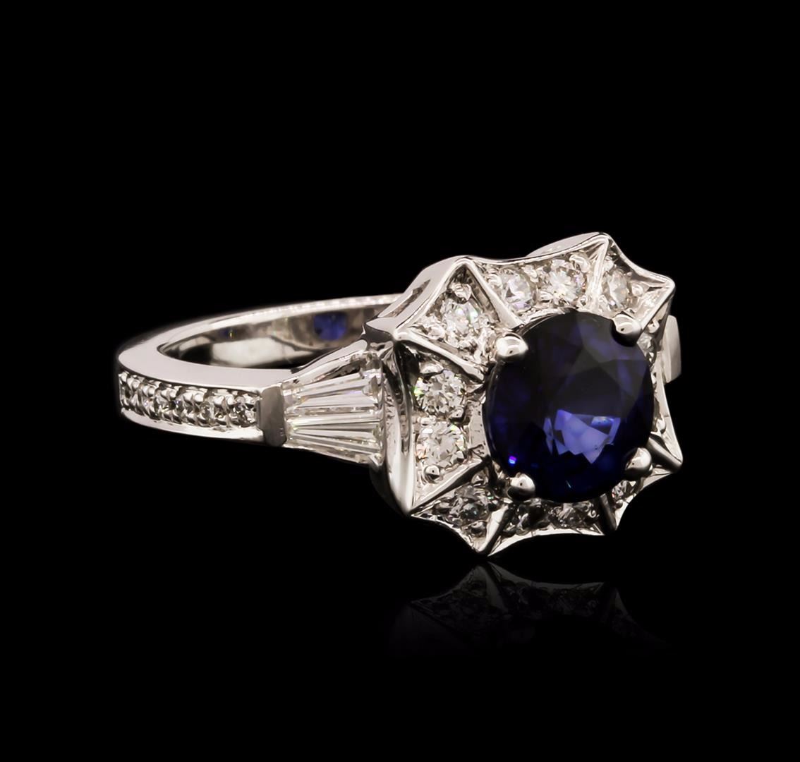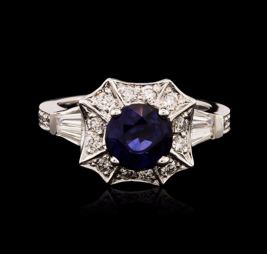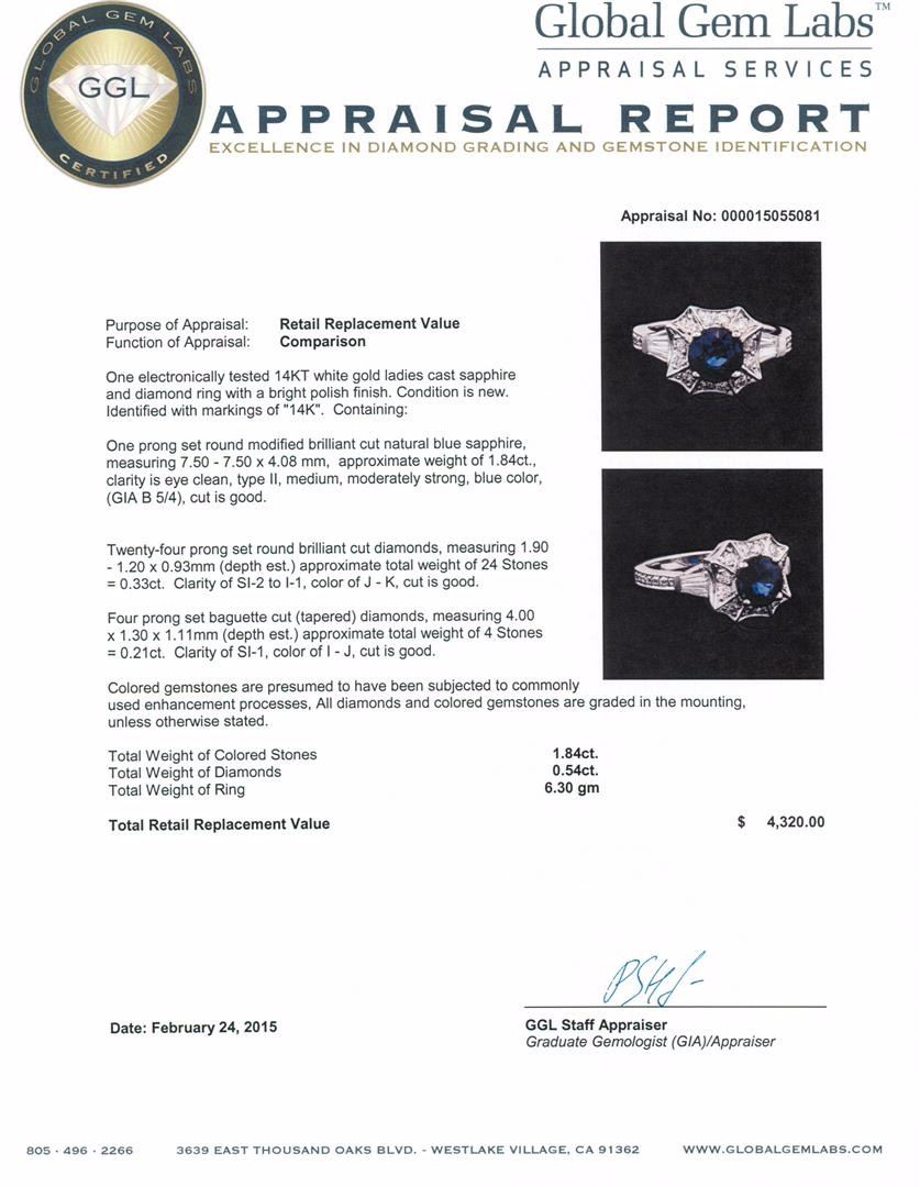 One electronically tested 14KT white gold ladies cast sapphire and diamond ring with a bright polish finish. Identified with markings of "14K". Condition is new. Containing: One prong set round modified brilliant cut natural blue sapphire, measuring 7.50 - 7.50 x 4.08 mm, approximate weight of 1.84ct., clarity is eye clean, type II, medium, moderately strong, blue color, (GIA B 5/4), cut is good. Twenty-Four prong set round brilliant cut diamonds, measuring 1.90 - 1.20 x 0.93mm (depth est.) approximate total weight of 24 Stones = 0.33ct. Clarity: SI-2 to I-1. Color: J - K, Cut is Good. Four prong set baguette cut (tapered) diamonds, measuring 4.00 x 1.30 x 1.11mm (depth est.) approximate total weight of 4 Stones = 0.21ct. Clarity: SI-1. Color: I - J, Cut is Good. Colored gemstones are presumed to have been subjected to commonly used enhancement processes, All diamonds and colored gemstones are graded in the mounting, unless otherwise stated. Total Weight of Colored Stones 1.84ct. Total Weight of Diamonds 0.54ct. Total Weight of Ring 6.30 grams. GGL Appraised at $4,320.00.